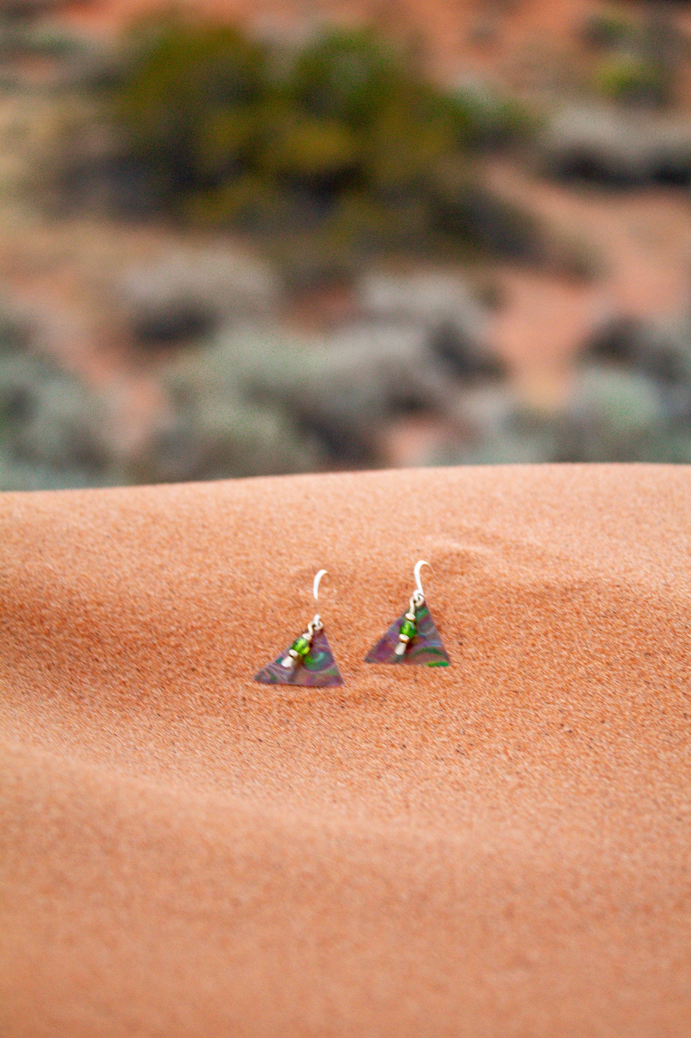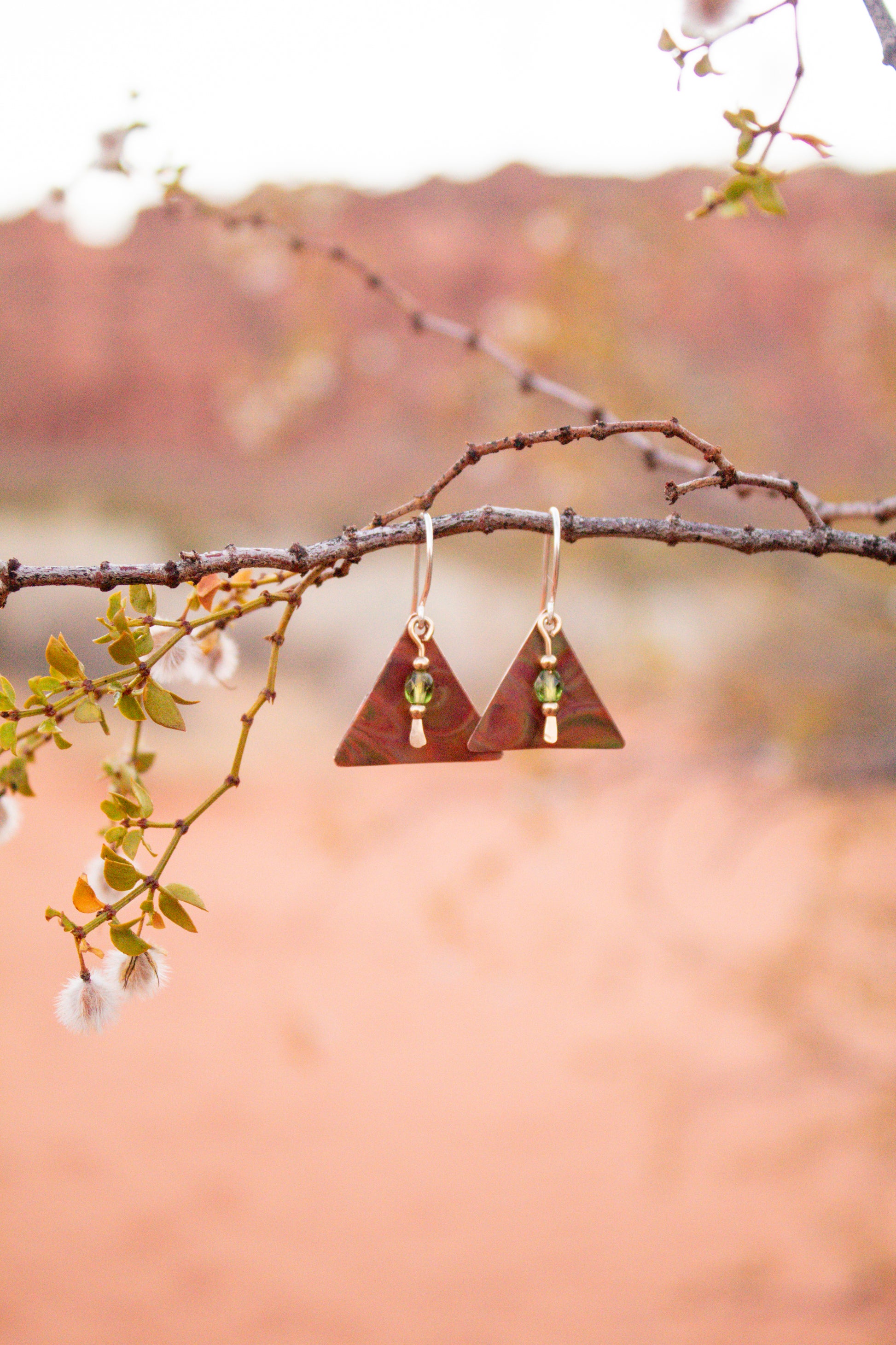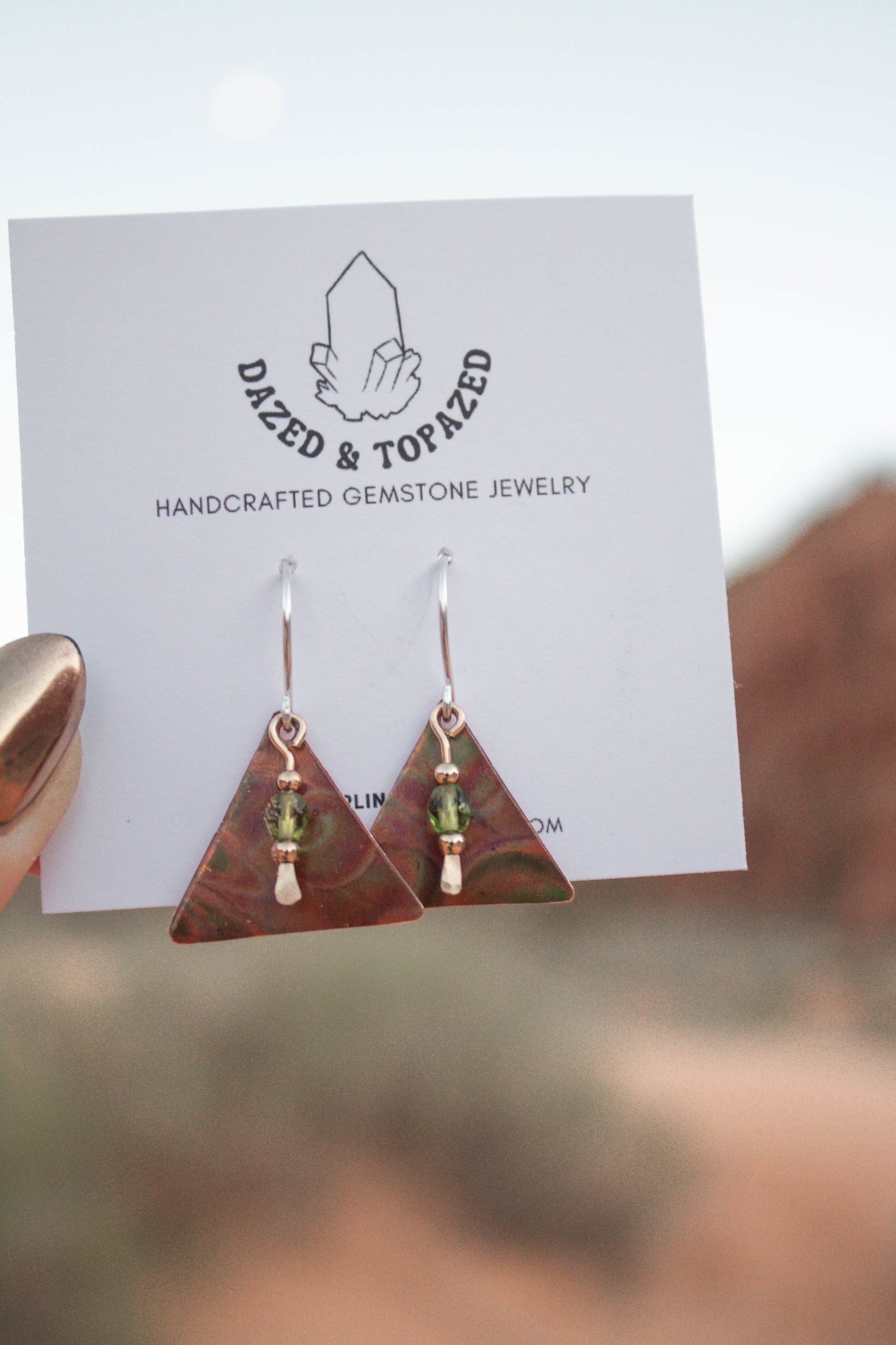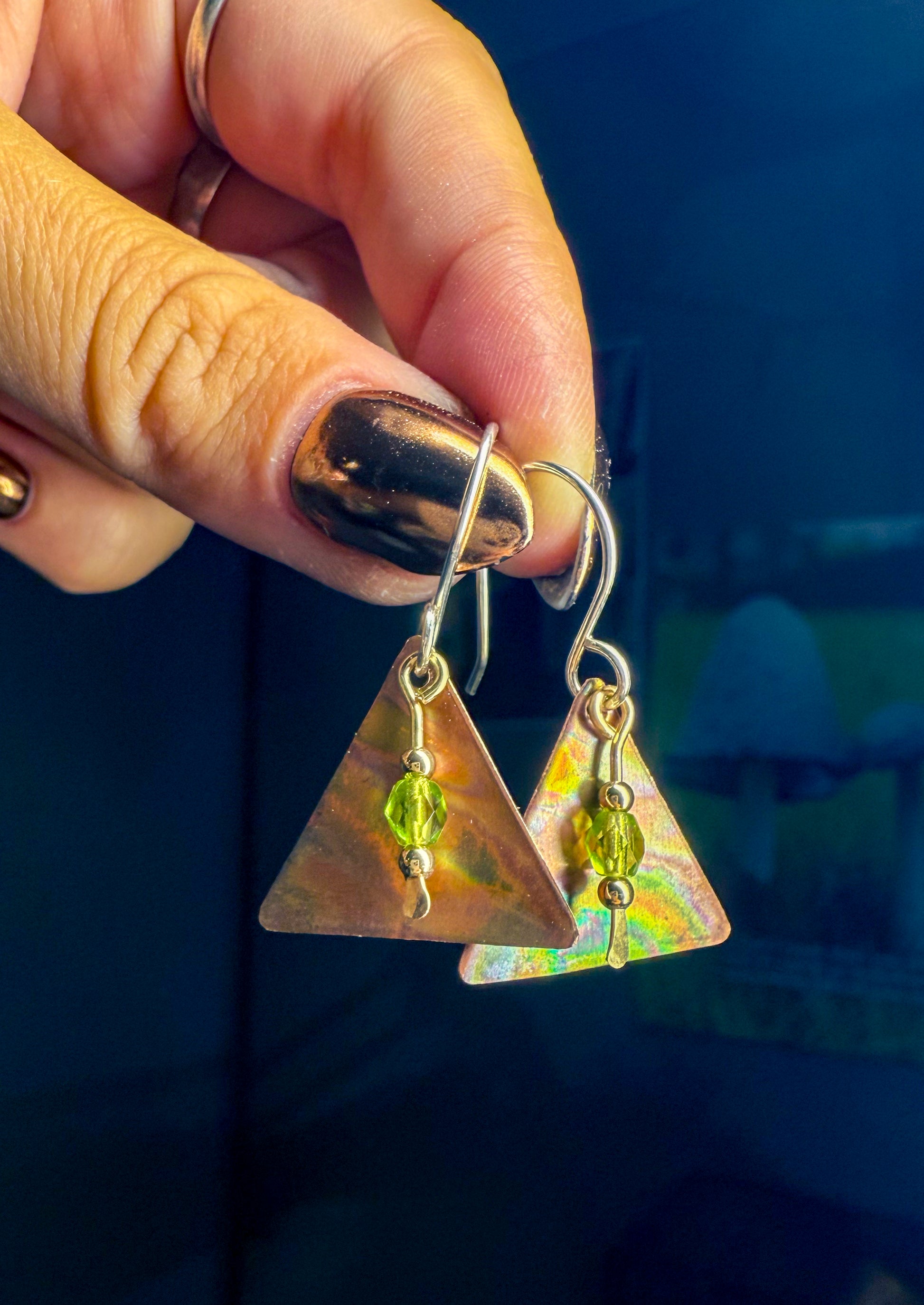 Each triangular copper piece is scorched with fire to create an iridescent finish that shifts like an oil spill, no two are alike. Accented with peridot (Aug Birthstone) and gold filled beads, they represent the contrast of destruction and rebirth. Lightweight, groovy, and bold, they hang from sterling silver ear wires for all day comfy wear.