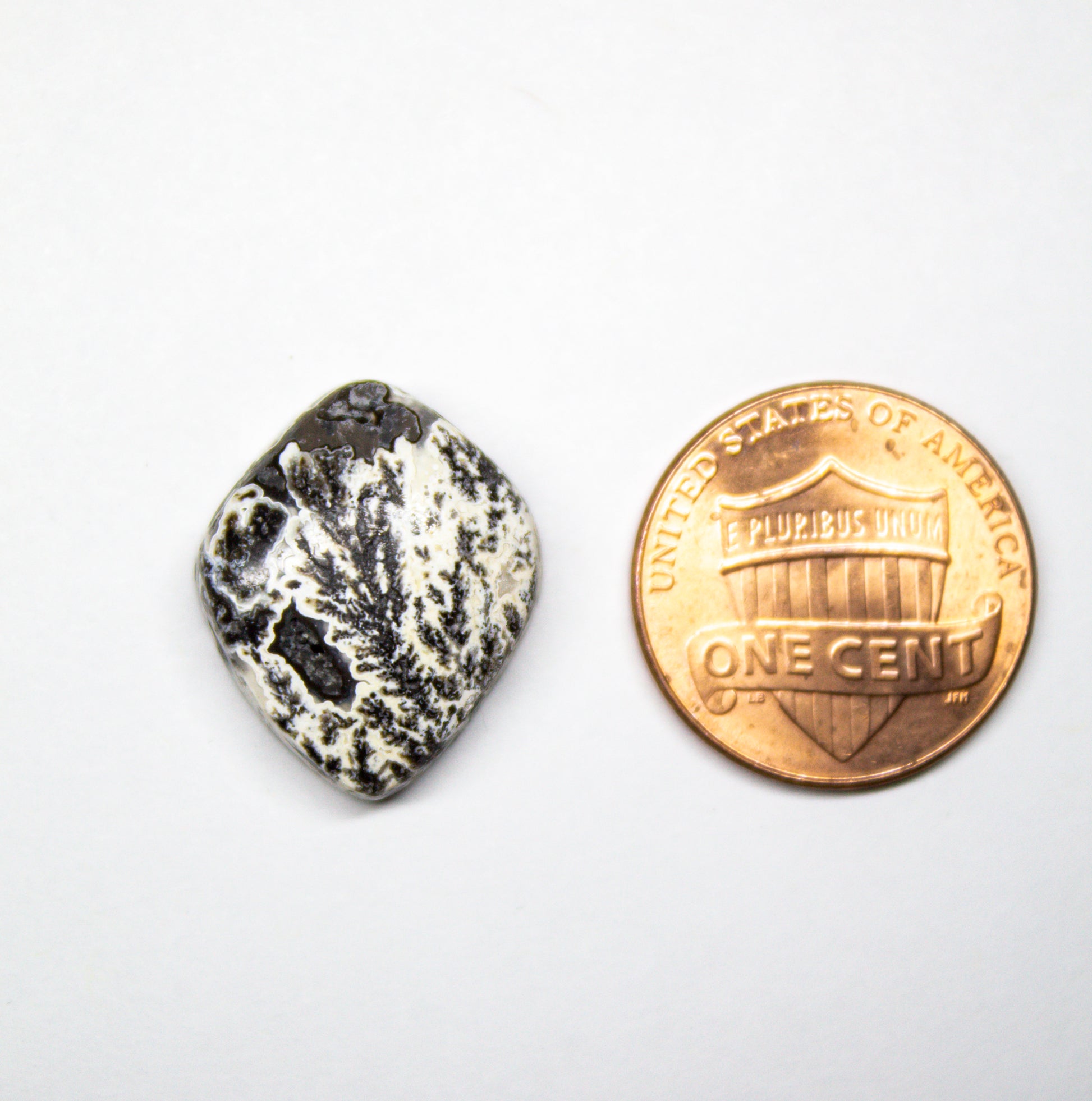 This polished black dendritic agate cabochon measures approximately 14mm x 12mm. Its shield like shape highlights intricate black, tree-like dendritic patterns set against a white background.