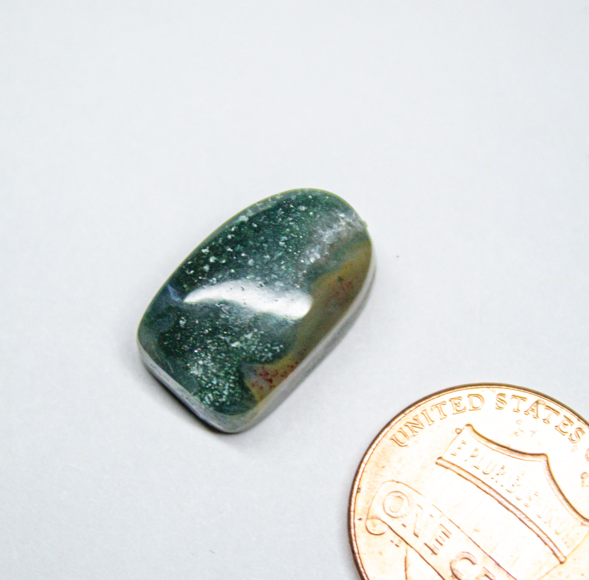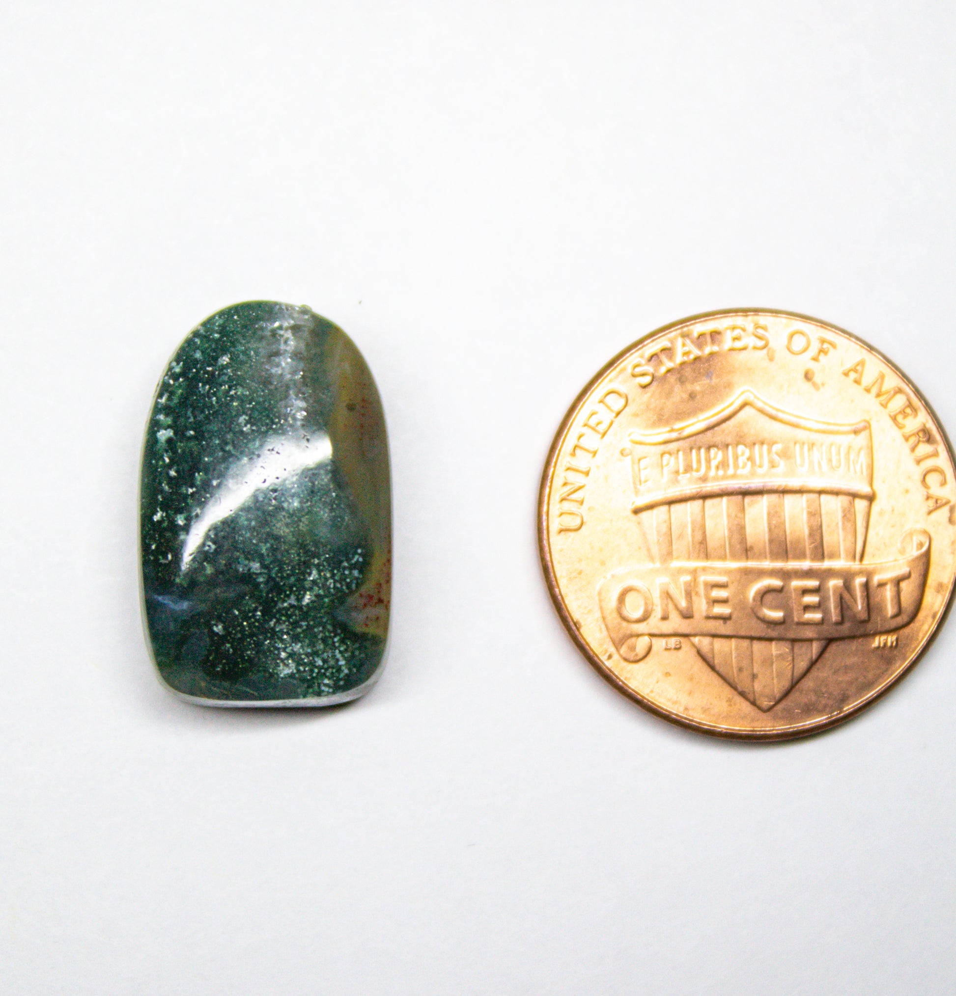 Moss agate is commonly found in regions such as Montana and Oregon, known for producing high-quality specimens with distinctive inclusions. Polished to a smooth finish, this cabochon is an excellent choice for collectors or as a unique piece in custom jewelry designs.