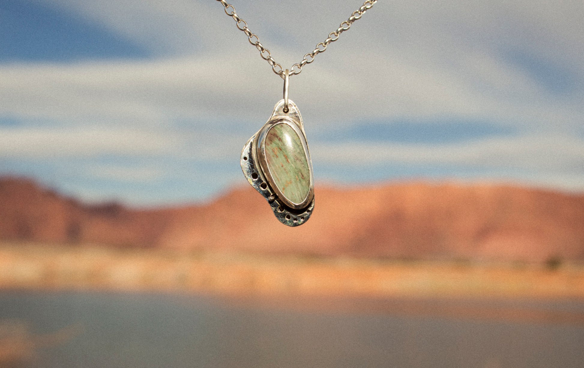 This handmade sterling silver butterfly wing locket, features a Crayola Jasper stone that mirrors the colorful patterns of real butterfly wing. Crafted by hand, the locket opens to hold a small photo or personal treasure.