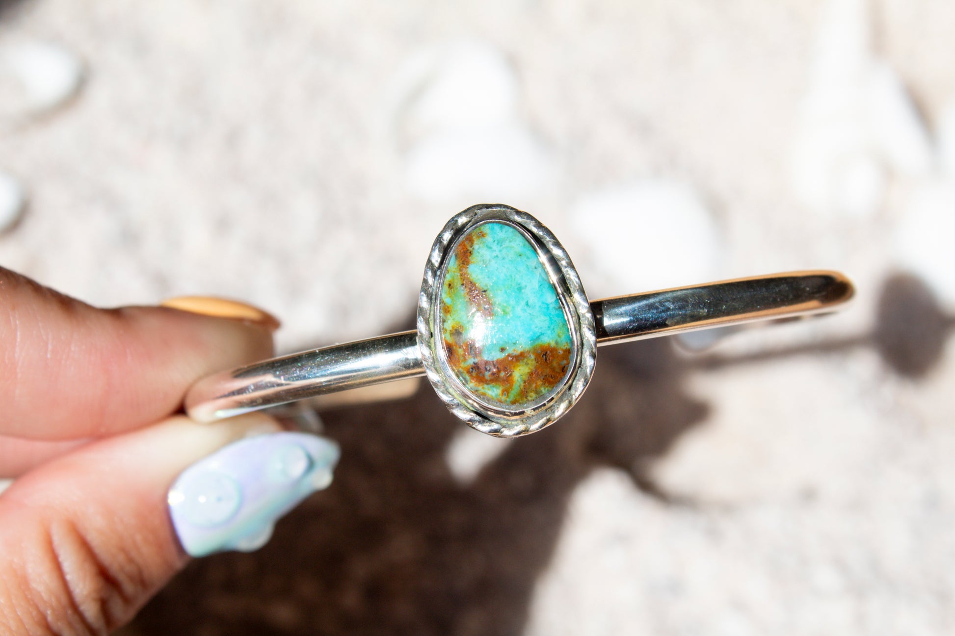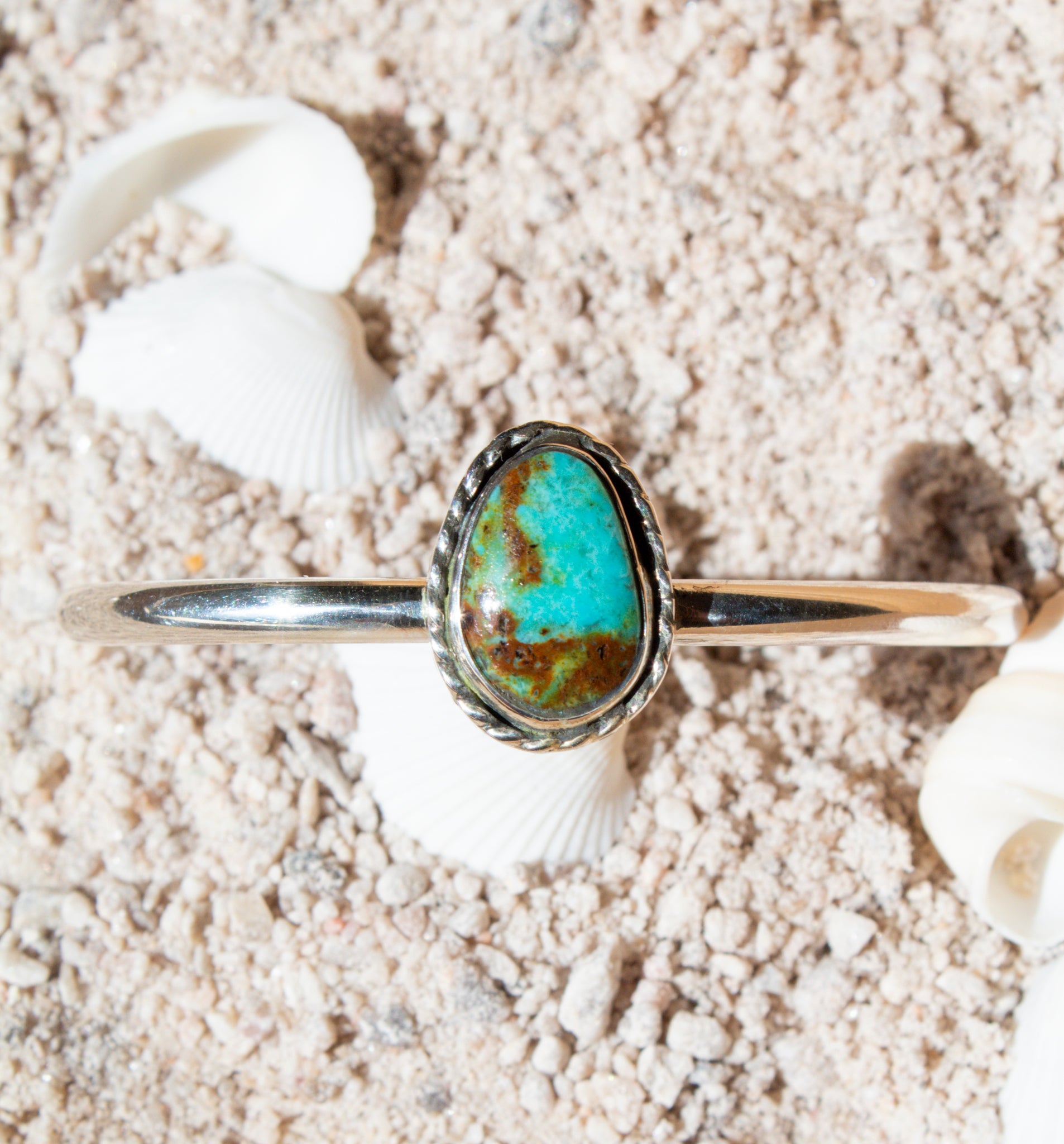 Handmade from solid sterling silver, this thick gauge cuff offers a comfortable small to medium sized fit. The center stone is a genuine Kingman turquoise stone, cut and polished in-house, with a natural matrix resembling a coastal islandscape viewed from above. This cuff is a timeless design perfect for everyday wear or stacking with your favorite summer staples!