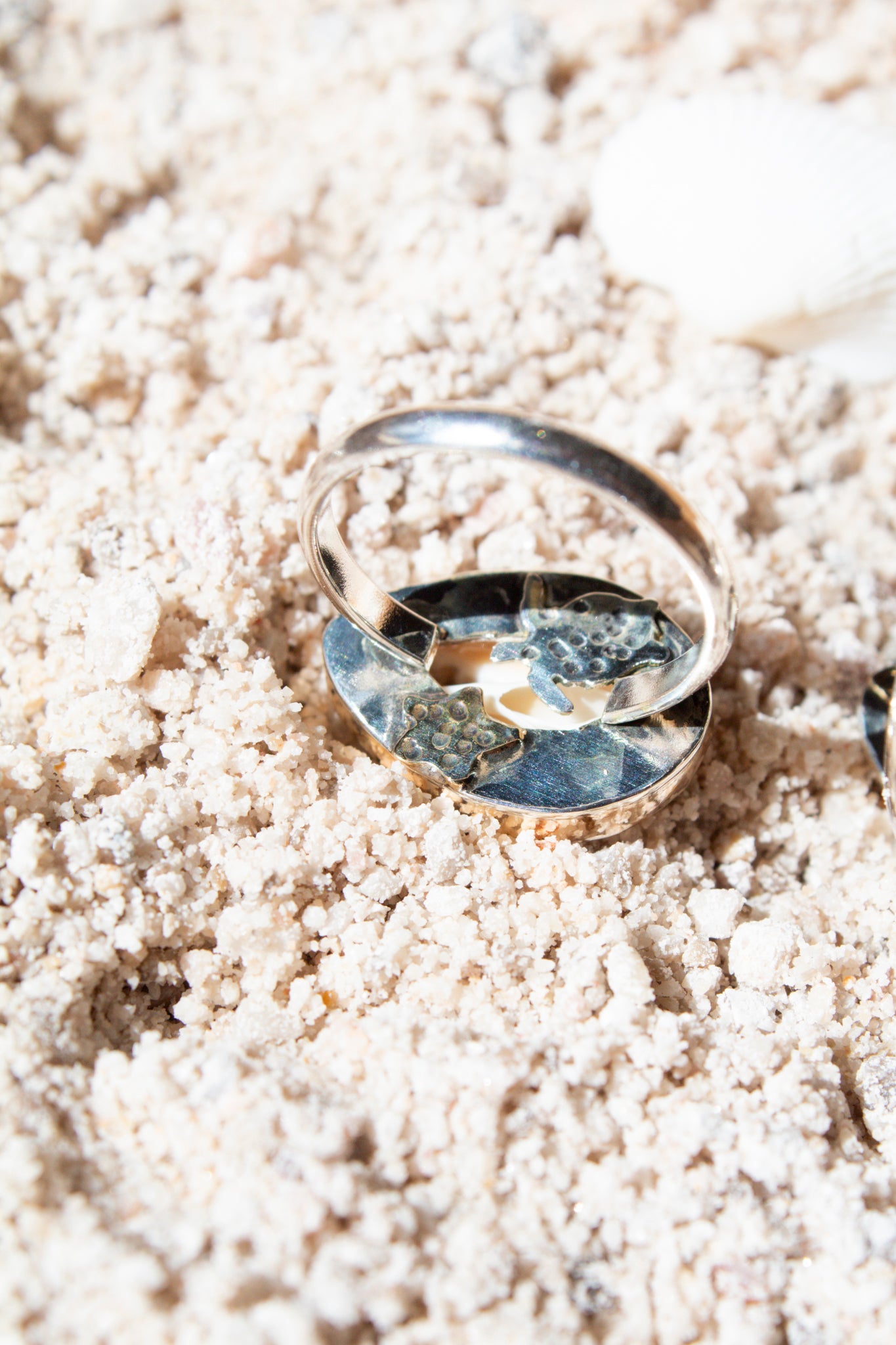 Handcrafted with real cowrie shells set in gold filled bezel, these beach rings hold a hidden surprise beneath the waves, a tiny silver sea turtle and brass starfish soldered on the backplate like little ocean totems.