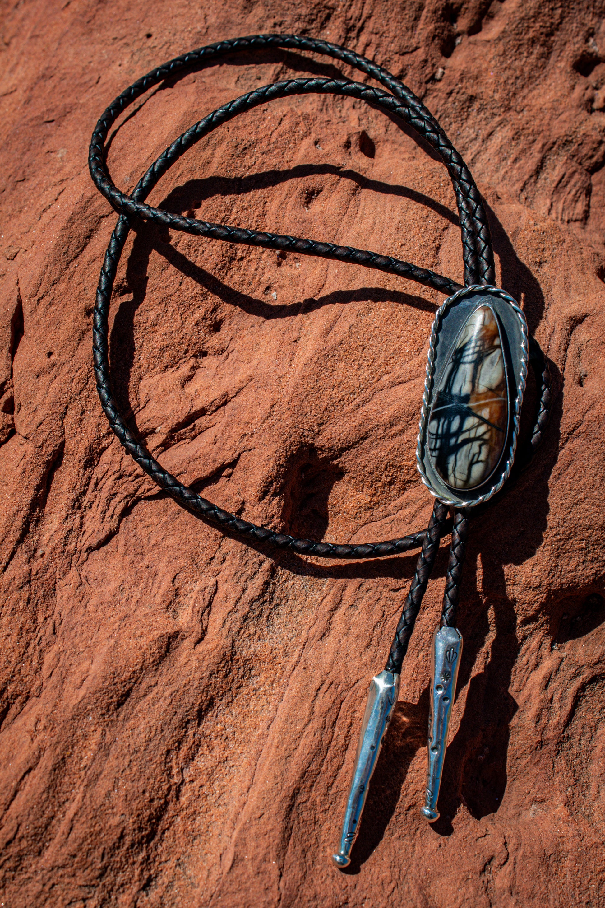 Handcrafted .925 sterling silver and Utah Picasso Marble Bolo tie on a genuine brown leather cord, with uniquely stamped handmade .925 sterling silver bolo tips