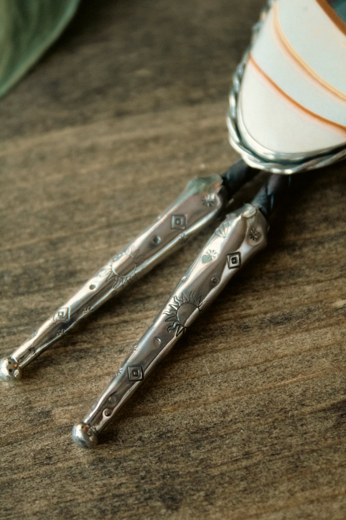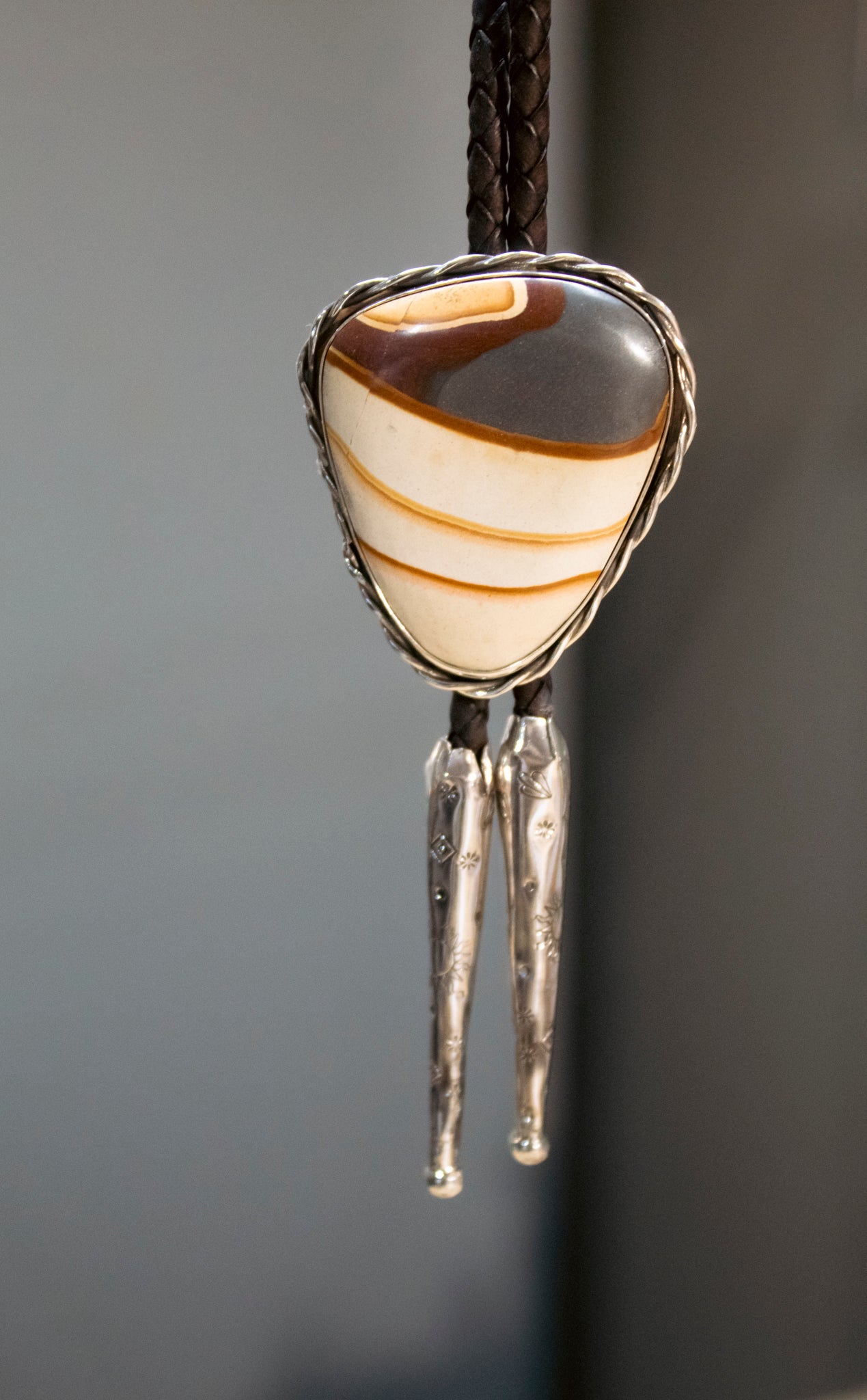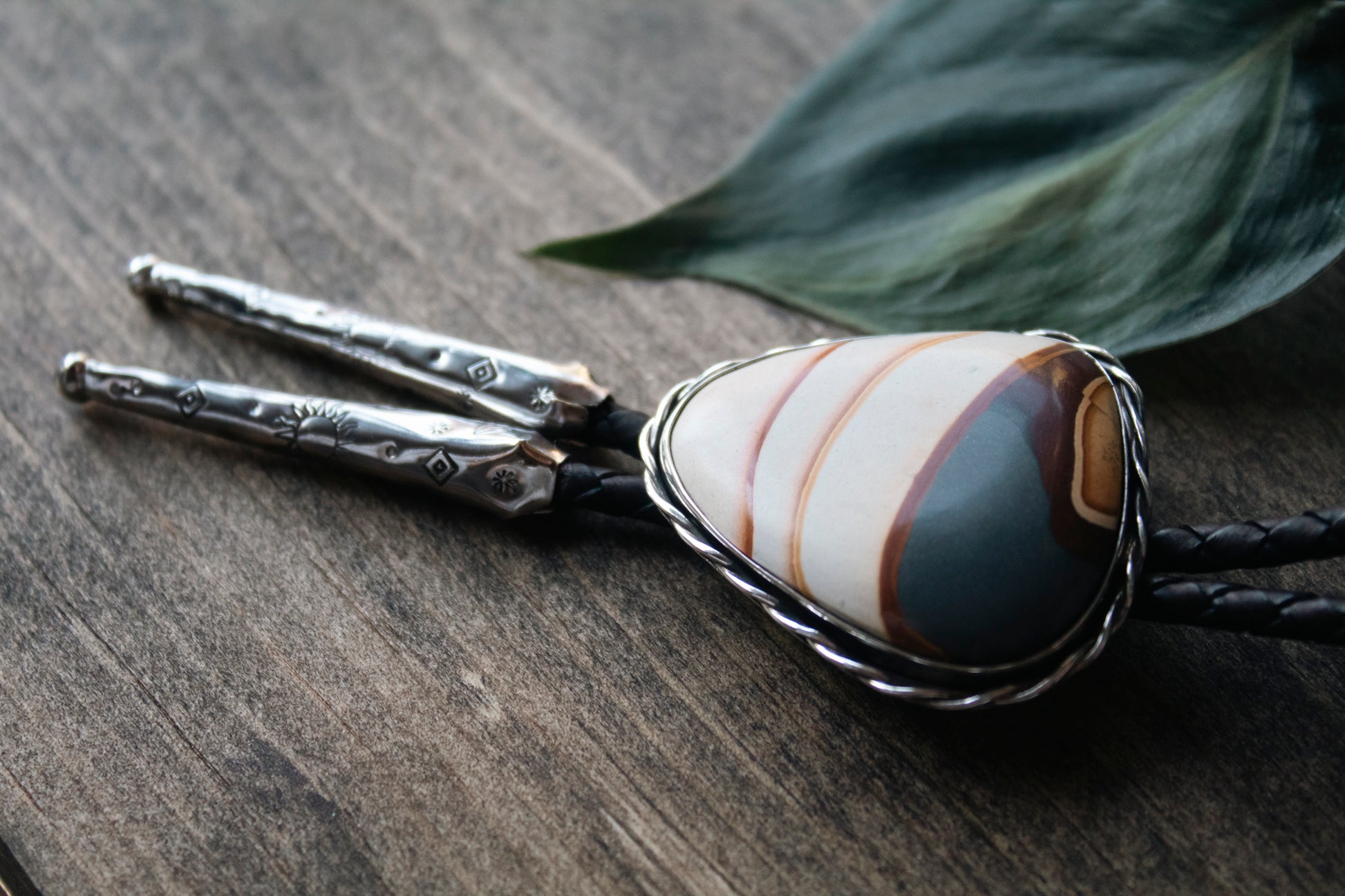 This bolo tie features a hand-cut Utah Wonderstone, set in sterling silver for a clean and classic look. Finished with handcrafted sun-stamped silver tips, this piece brings a bit of desert charm and authenticity. It’s crafted on a 36-inch brown leather cord, offering a versatile style that reflects the unique landscapes of Utah.