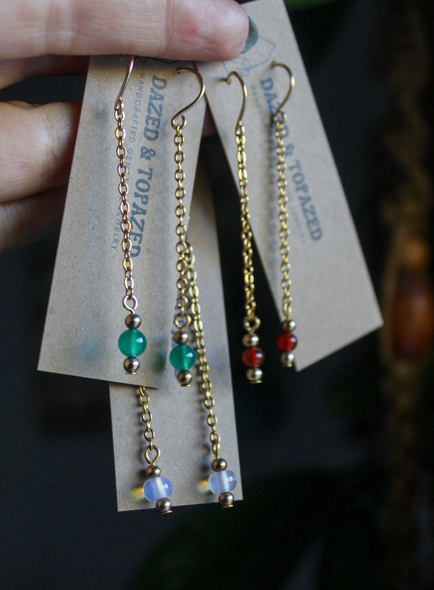 Dainty with a touch of magic, these gemstone pendulum earrings swing with gold and polished stone beads suspended from a fine gold filled chain, on 14k gold filled hook earrings.