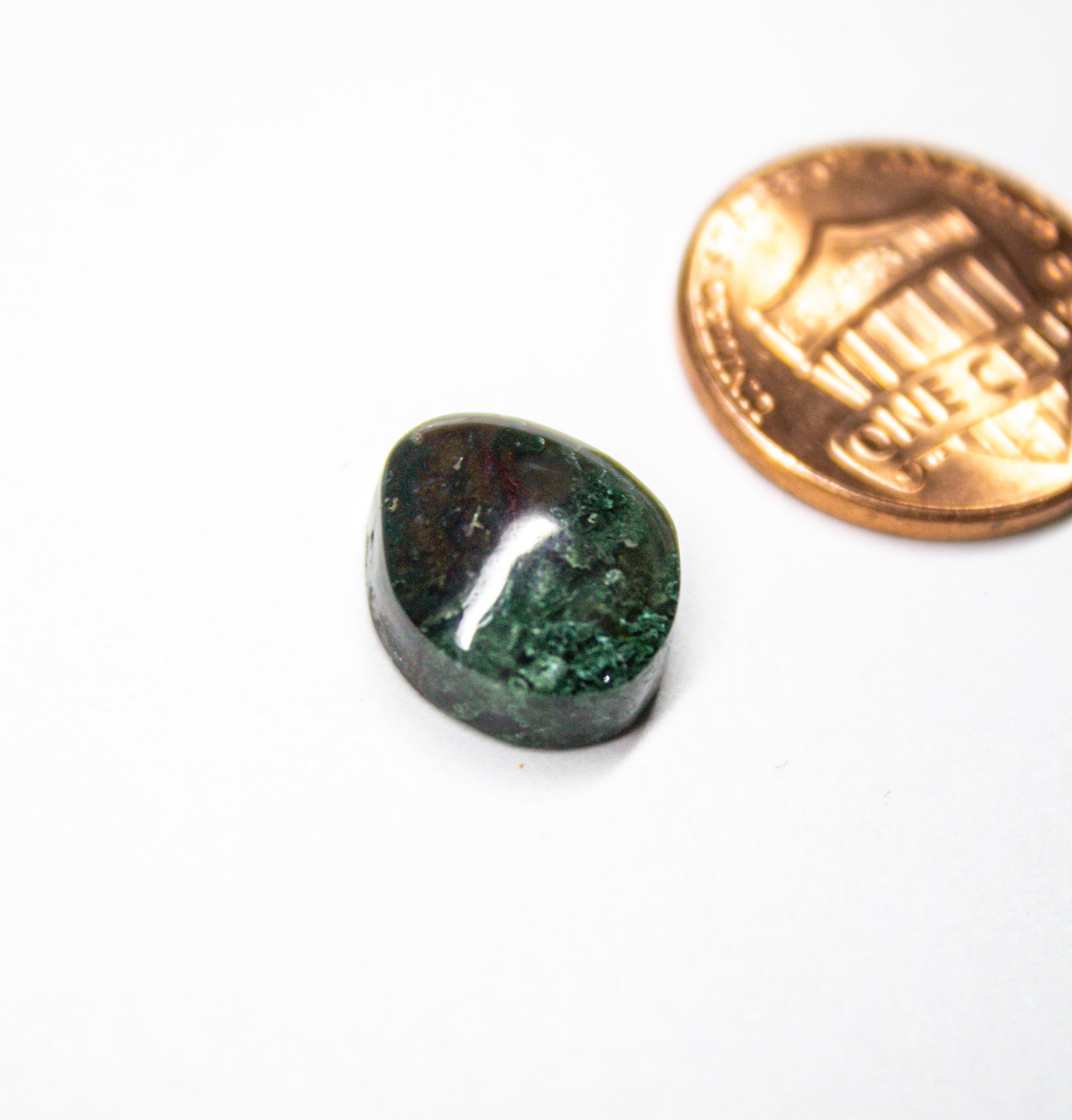This polished green moss agate cabochon, approximately 12mm x 10mm, showcases a vibrant, earthy greens, blues, and reds, with delicate moss-like inclusions, giving it an organic look.