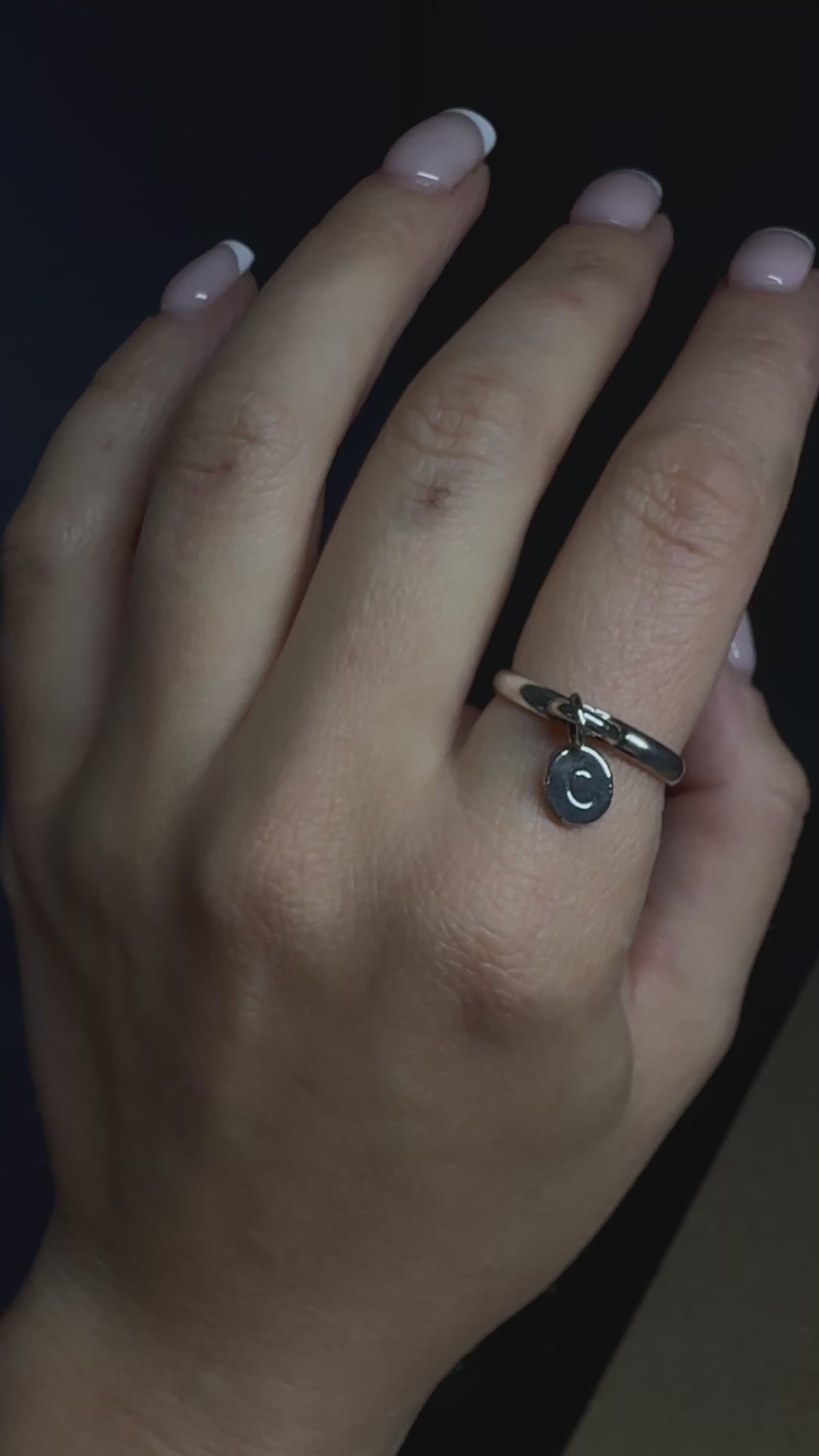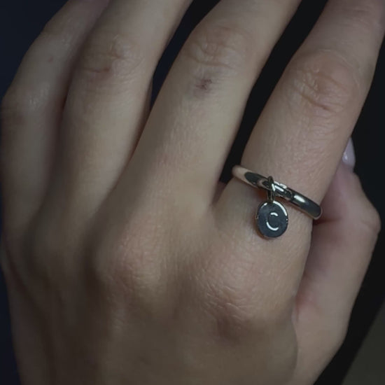 This handcrafted charm ring is made from pressed recycled sterling silver and finished with a hand-stamped initial charm. Each charm is stamped one by one, giving every ring subtle variations and a personal feel.