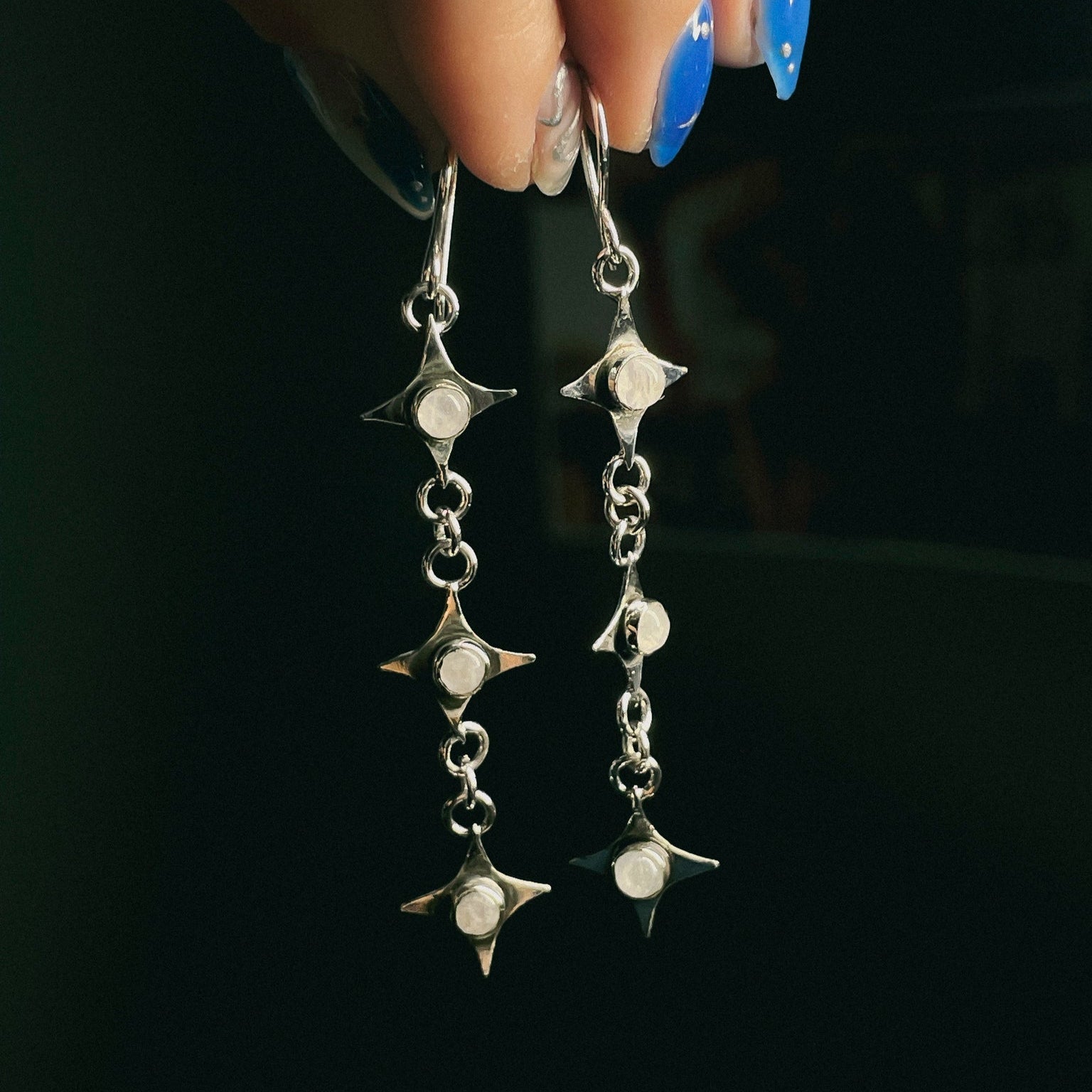 Crafted as an ode to summer nights under the stars, these handmade earrings feature sterling silver star links and six glowing moonstones.