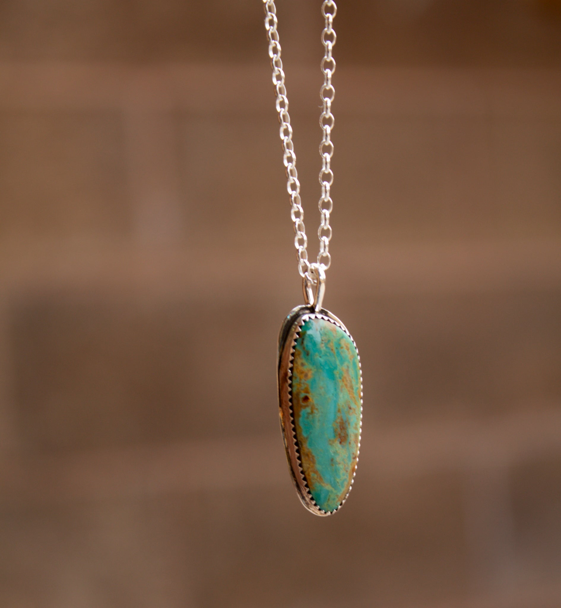 An elongated Kingman turquoise set in silver, hanging just right on an 22” rolo chain.