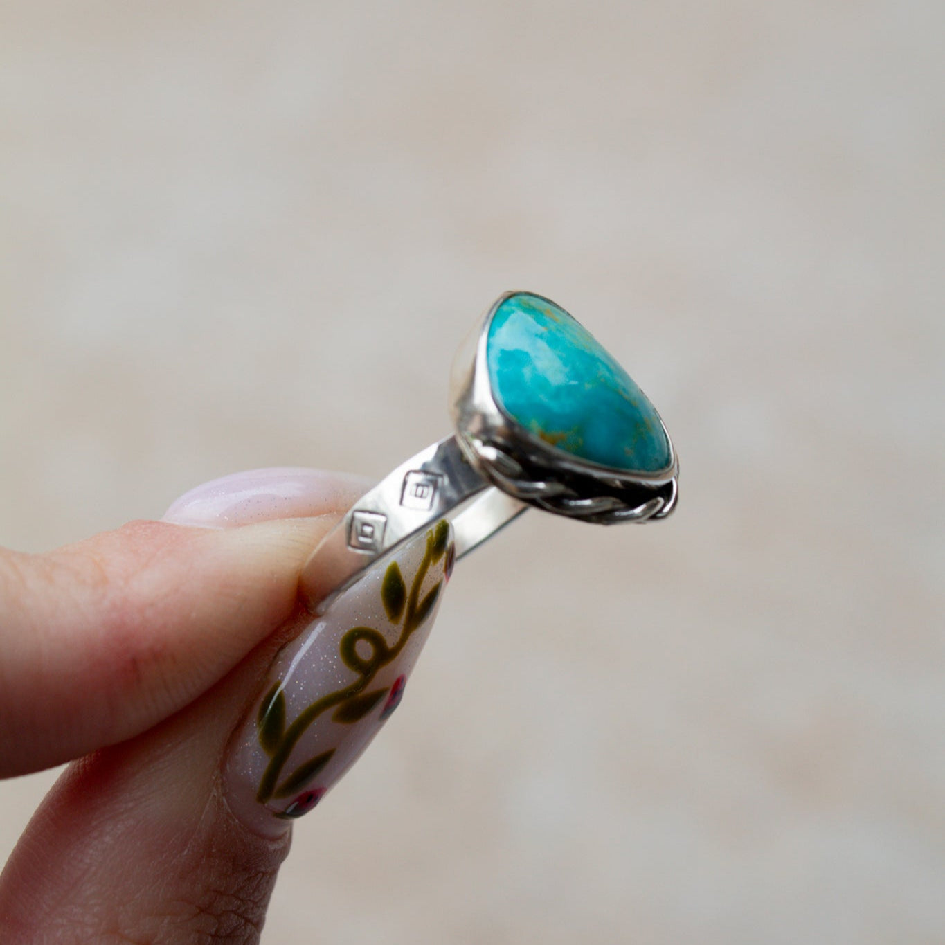 A triangle Kingman turquoise stone wrapped in half-rope detail, set on a hand-stamped silver band. Unique, bold, and made by hand. Size 8.5