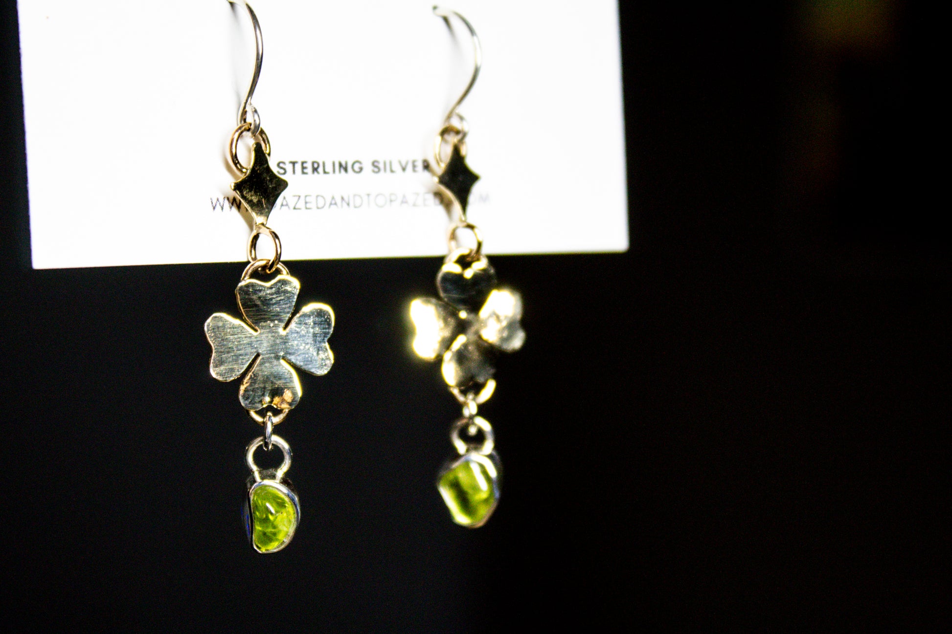These March drops are handcrafted with glowing peridot stones, brass lucky shamrock charms, and sterling silver ear hooks. The green peridot catches the light in that fresh, early-spring way.