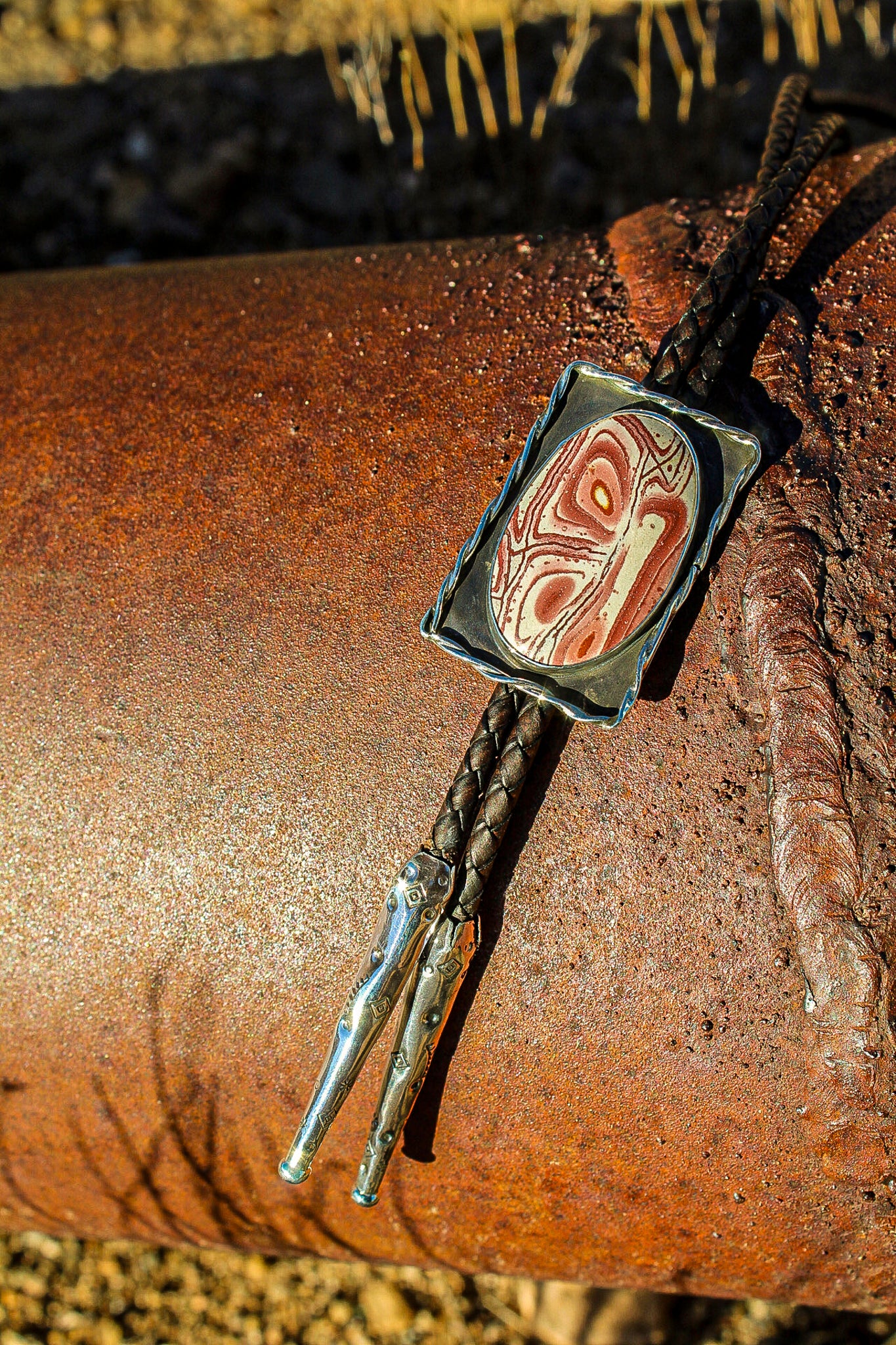 The Mesa Moth Bolo captures the raw beauty of the desert with a Utah Rhyolite stone in warm, red earthy tones. The stone showcases natural textures and patterns reminiscent of reflect the form of a geometric butterfly, canyon walls, or desert mesas. Set in sterling silver and finished with geometric-stamped silver tips, this piece brings together organic shapes with a touch of vintage style. Strung on a 36-inch brown leather cord, the Mesa Moth is a bold tribute to the spirit of the West.