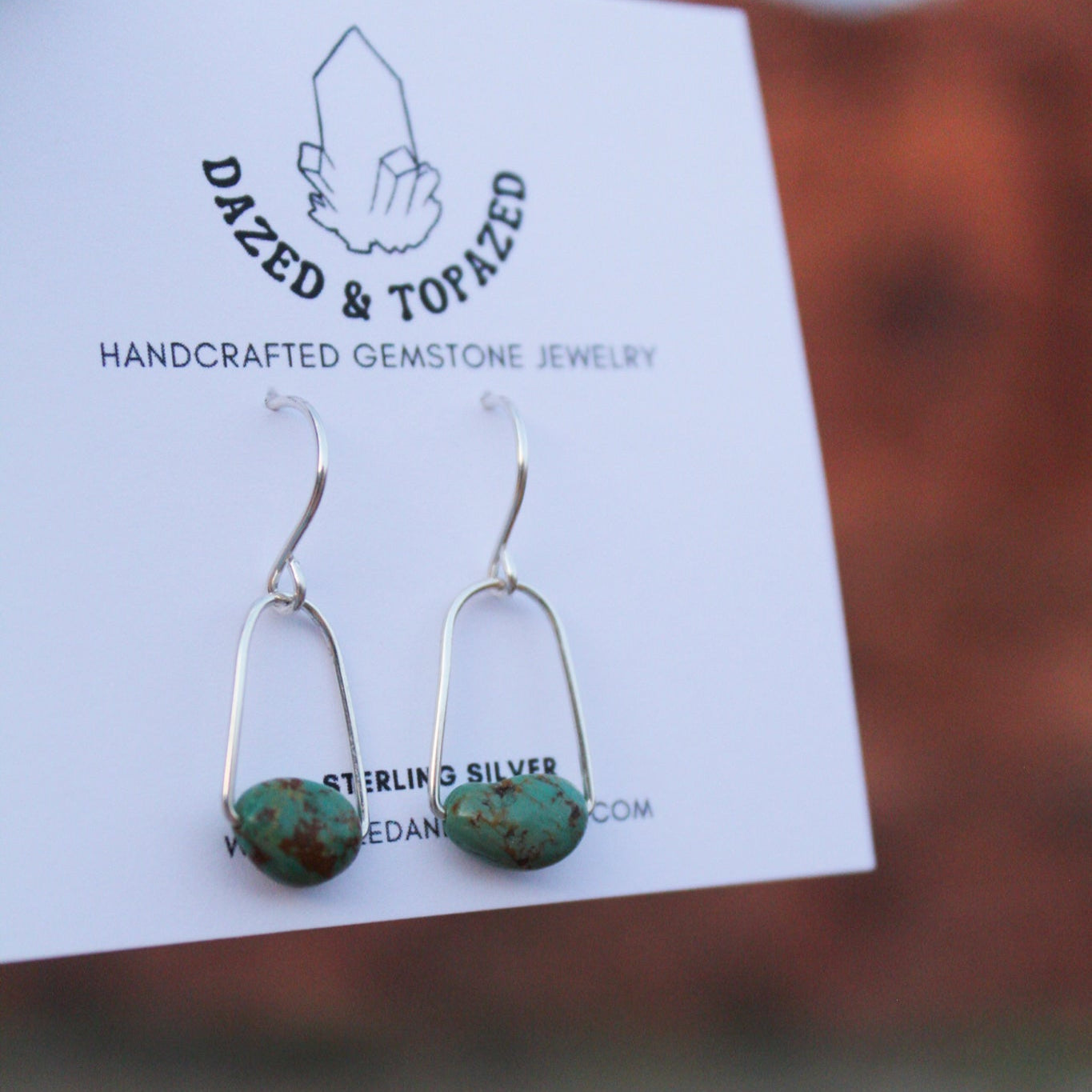 Minimal and earthy, these earrings feature natural Sonoran Turquoise beads suspended on a looped sterling silver frame. Lightweight and easy to wear, they bring just the right touch of desert color to any look.