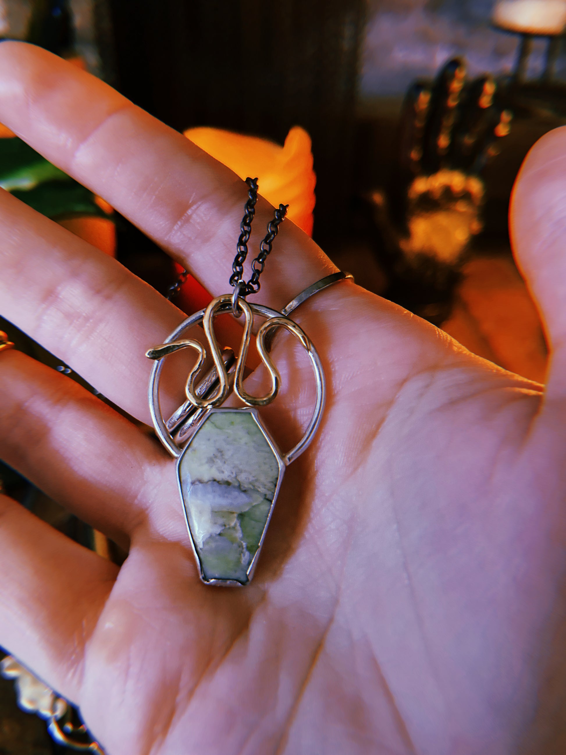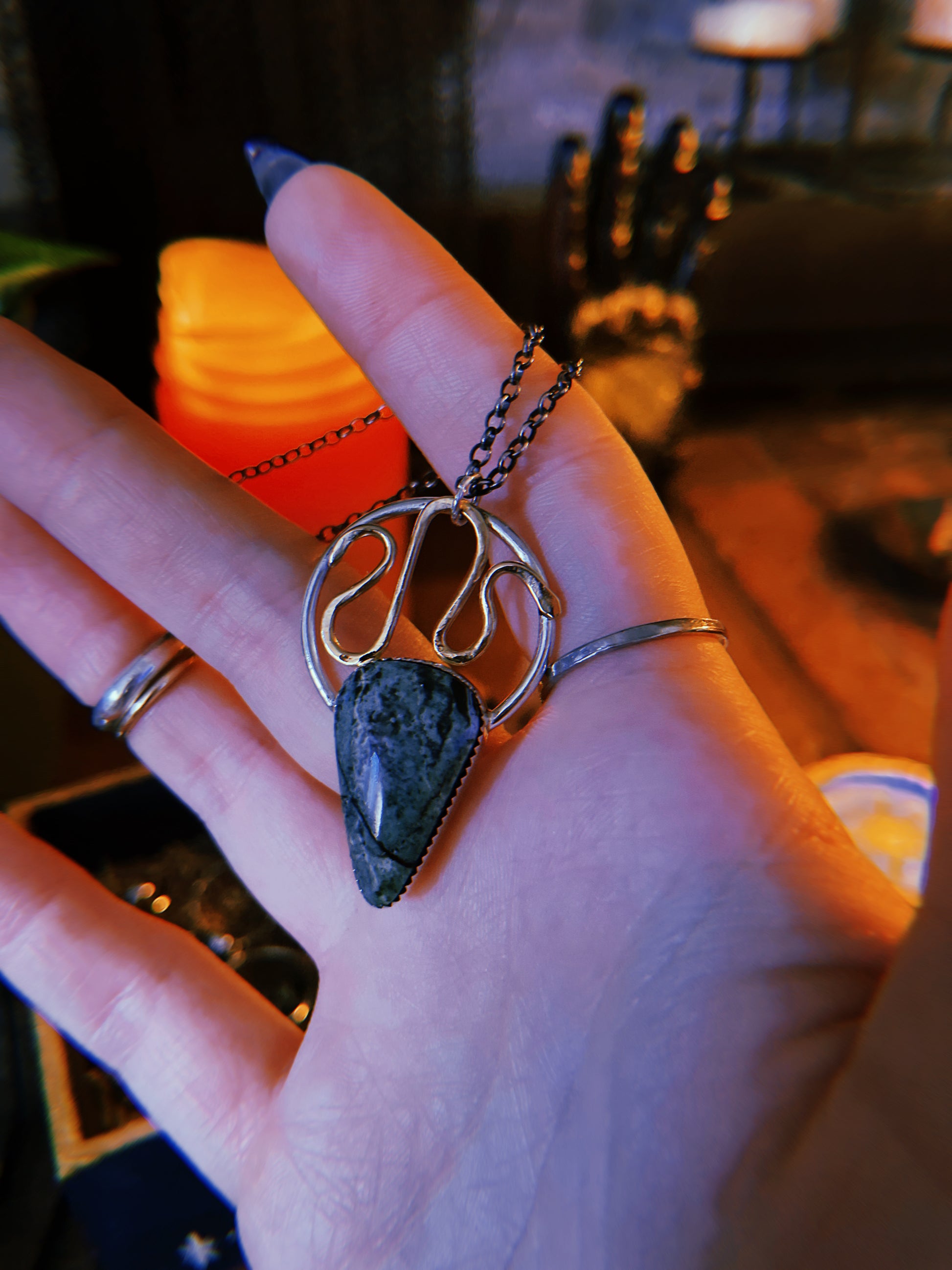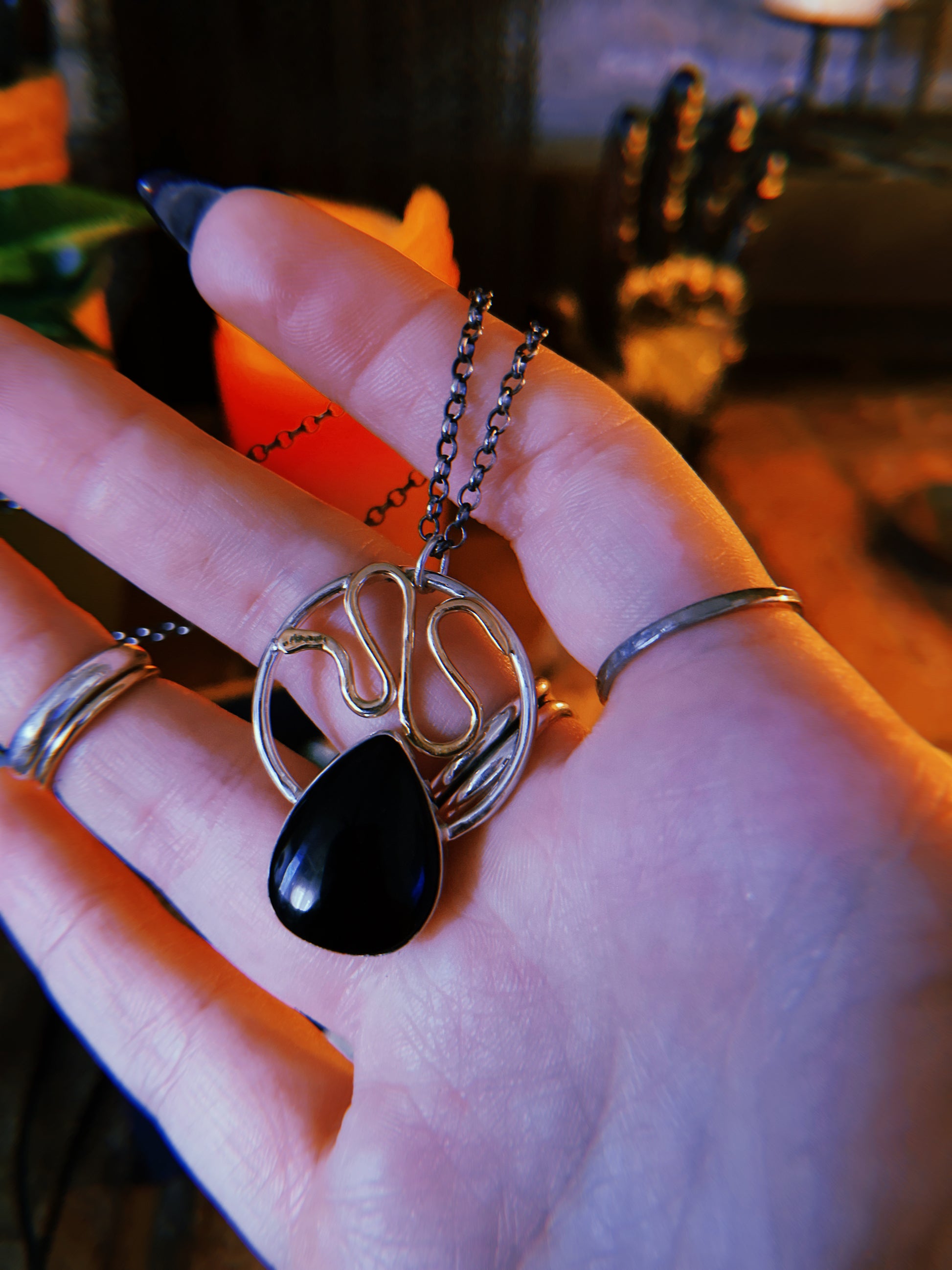 Handmade with .925 Sterling Silver and a 14k gold filled snake embellishment on 18" oxidized sterling silver rolo chains