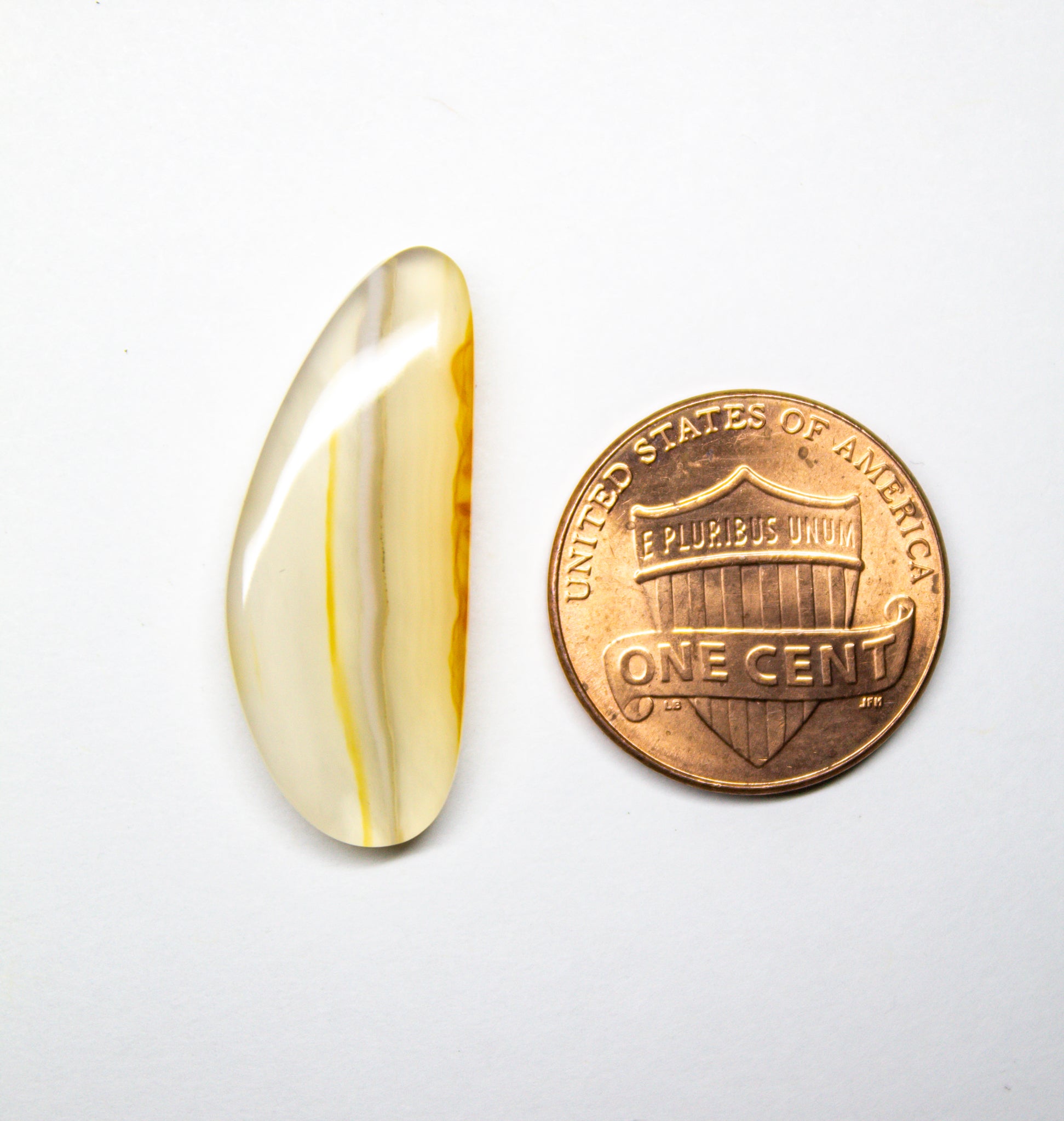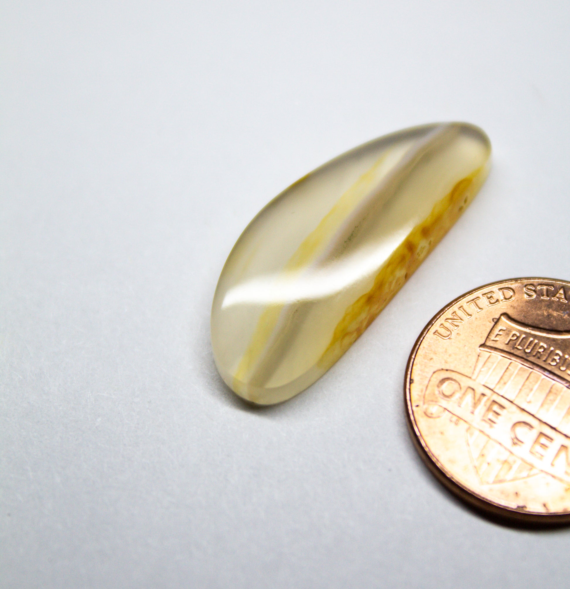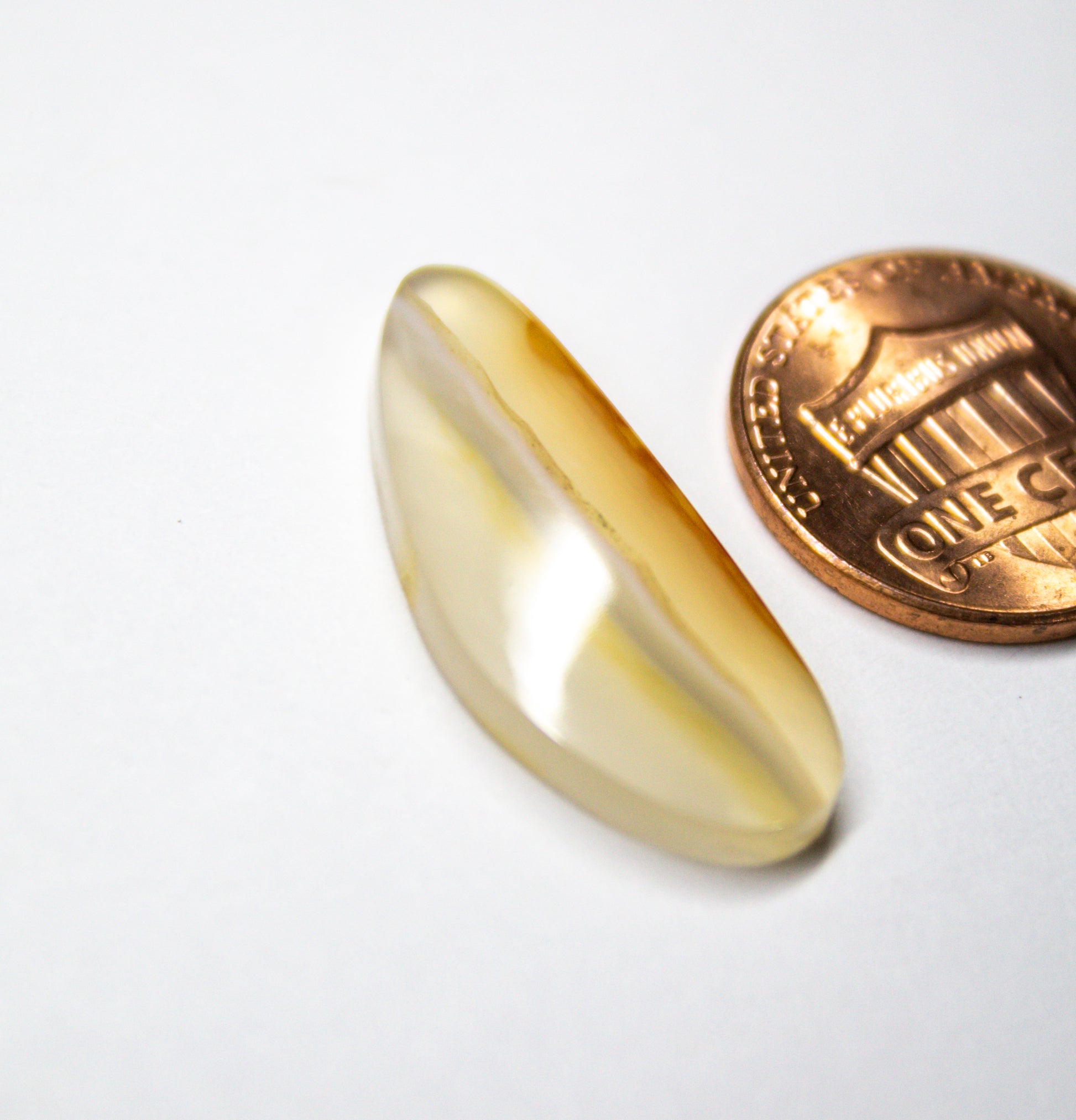 This Montana agate cabochon, measuring approximately 30mm x 12mm, features soft bands of yellow and cream flowing through a translucent base. The warm tones and natural banding showcase the unique beauty of Montana agates.