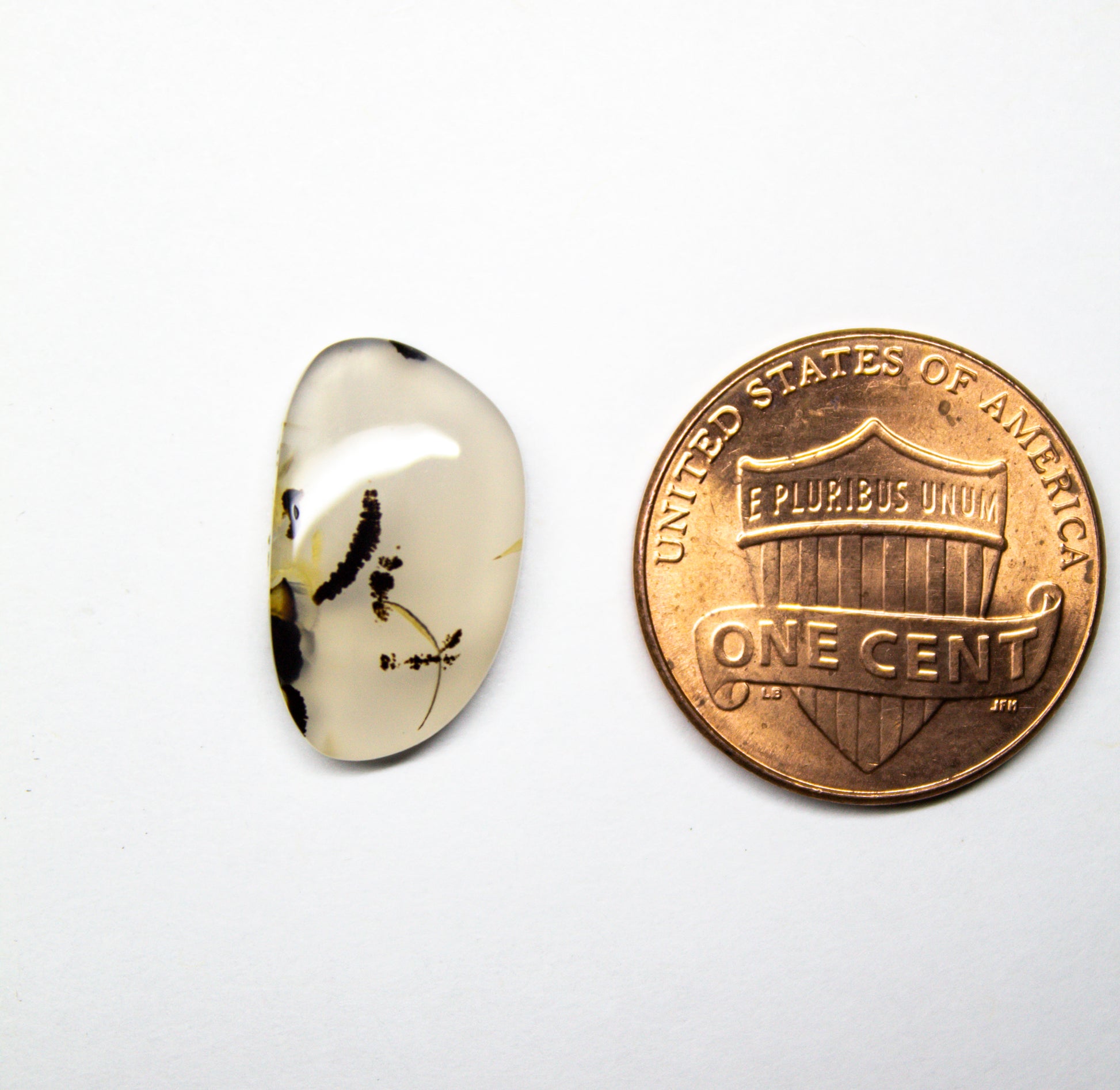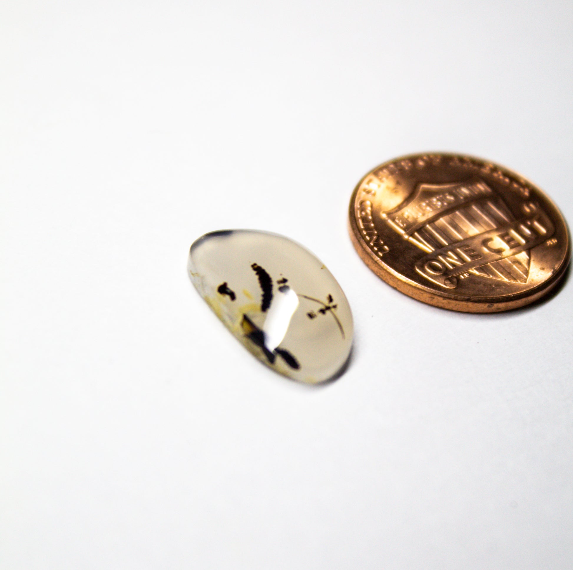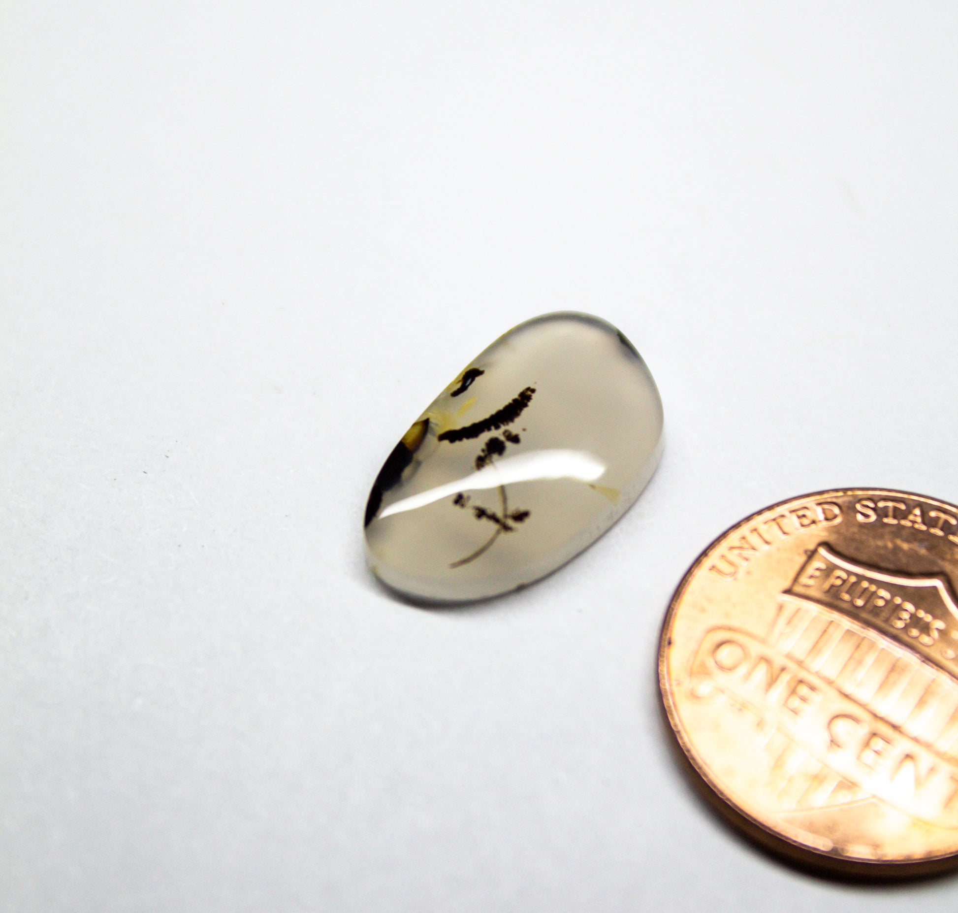 This dainty Montana agate cabochon, measuring approximately 20mm x 10mm, features a translucent base with distinct, dark inclusions that form unique, branching patterns. These natural patterns create an intricate design within the stone, adding depth and interest.