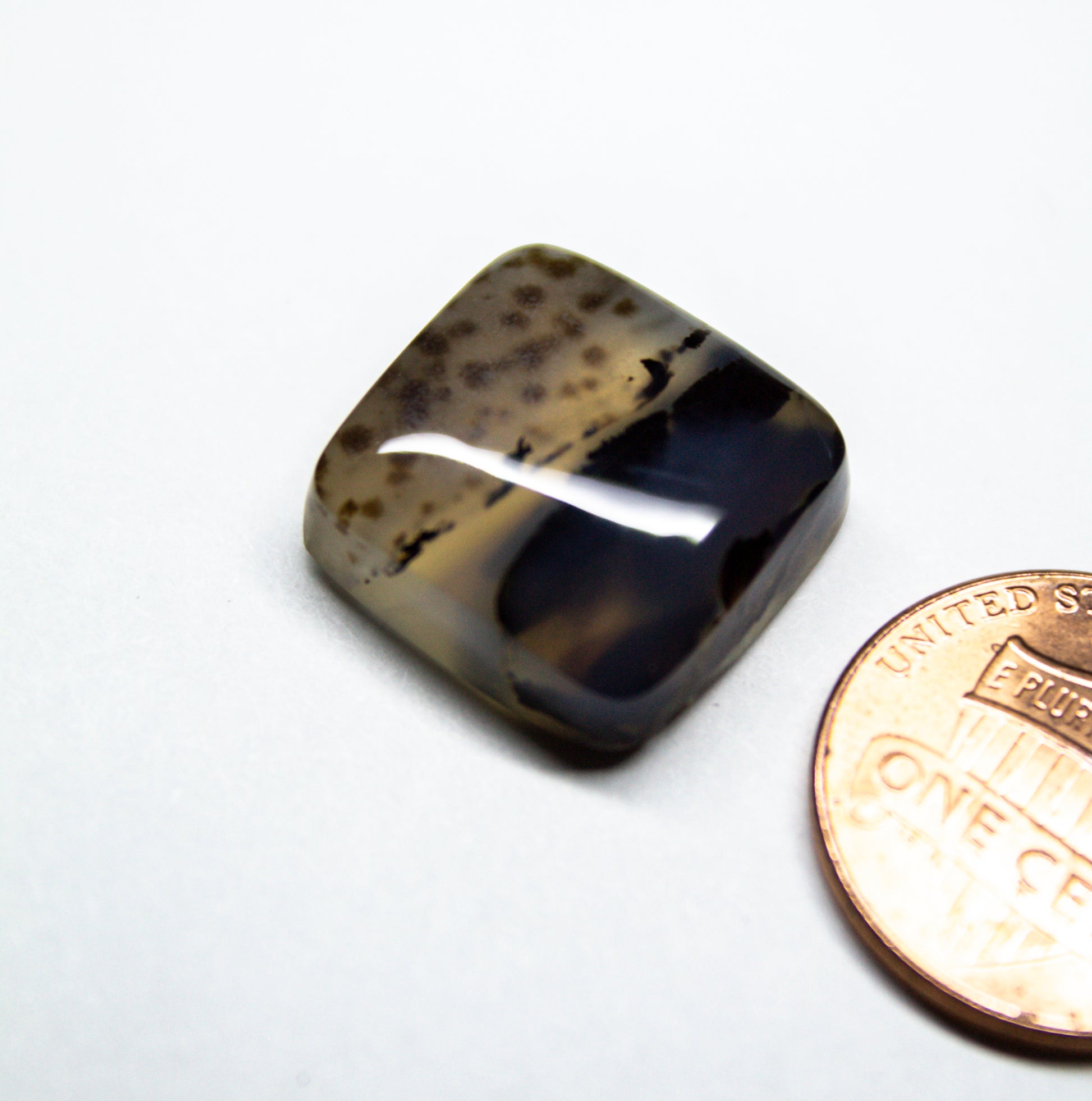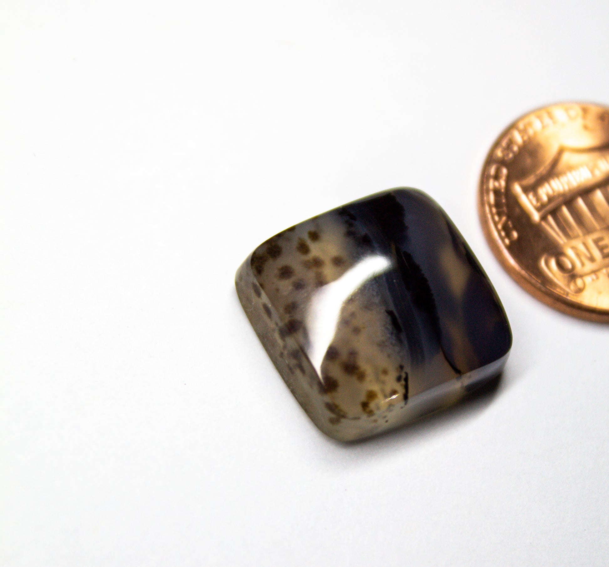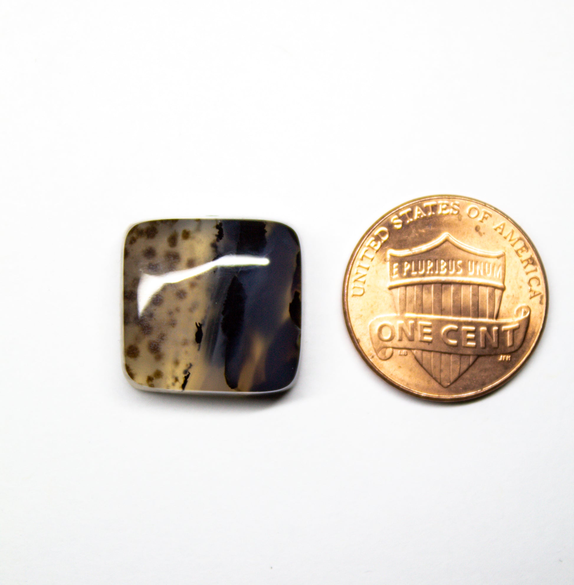 This Montana Agate cabochon, measuring approximately 18mm x 18mm, features a square shape with a polished finish that enhances its natural beauty. The stone has a translucent base with a combination of dark and light areas, accented by small speckled inclusions that give it depth and character.