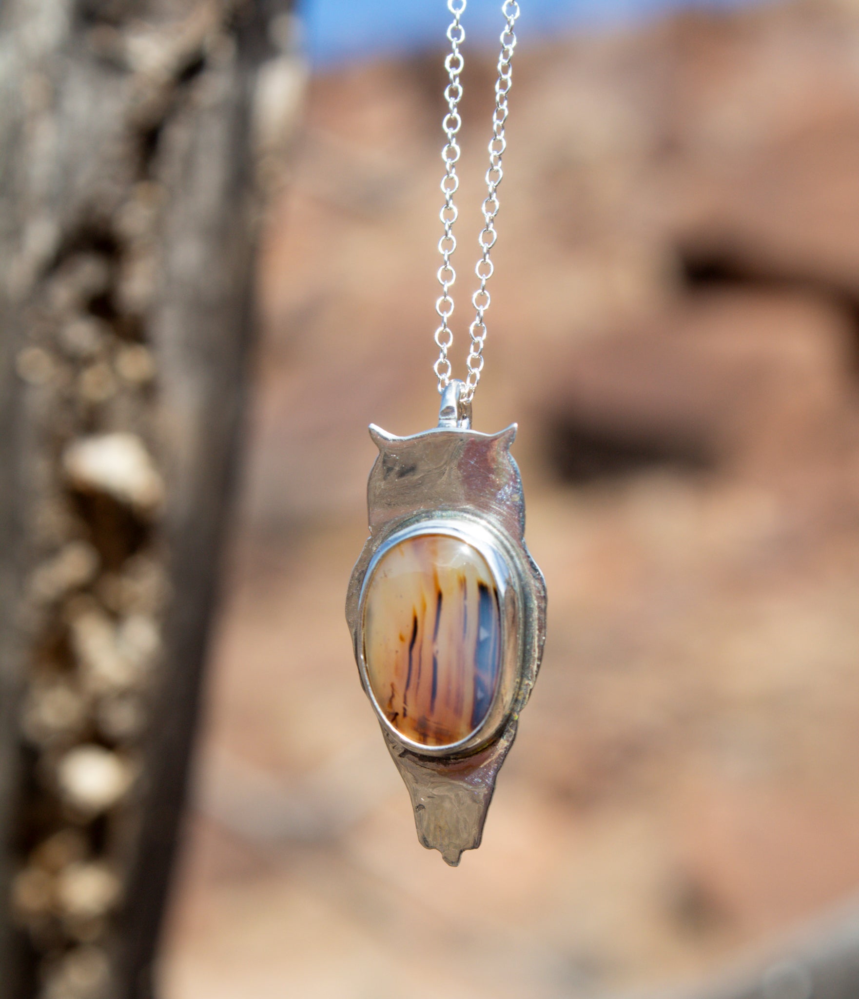 This handcrafted sterling silver pendant features a horned owl silhouette holding a natural Montana Agate. Designed with an open-cut setting, the agate glows when illuminated, the stone’s warm hues shift the light in smoky patterns resembling the mysterious watch of an owl.