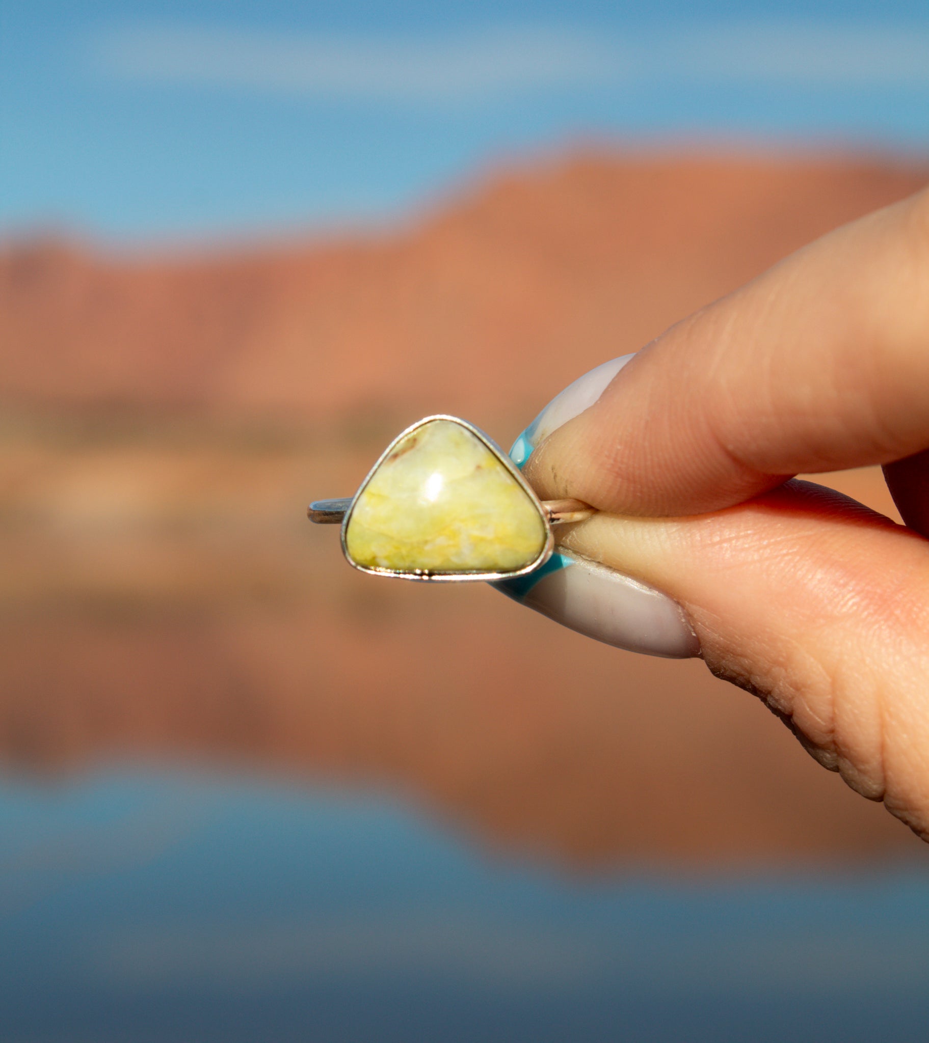 This handcrafted ring features a natural yellow-green serpentine stone, cut into a triangular shape and set simply in sterling silver. Named for its serpent-like patterns and smooth texture, Serpentine is known to be associated with kundalini energy, renewal, and spiritual awakening.