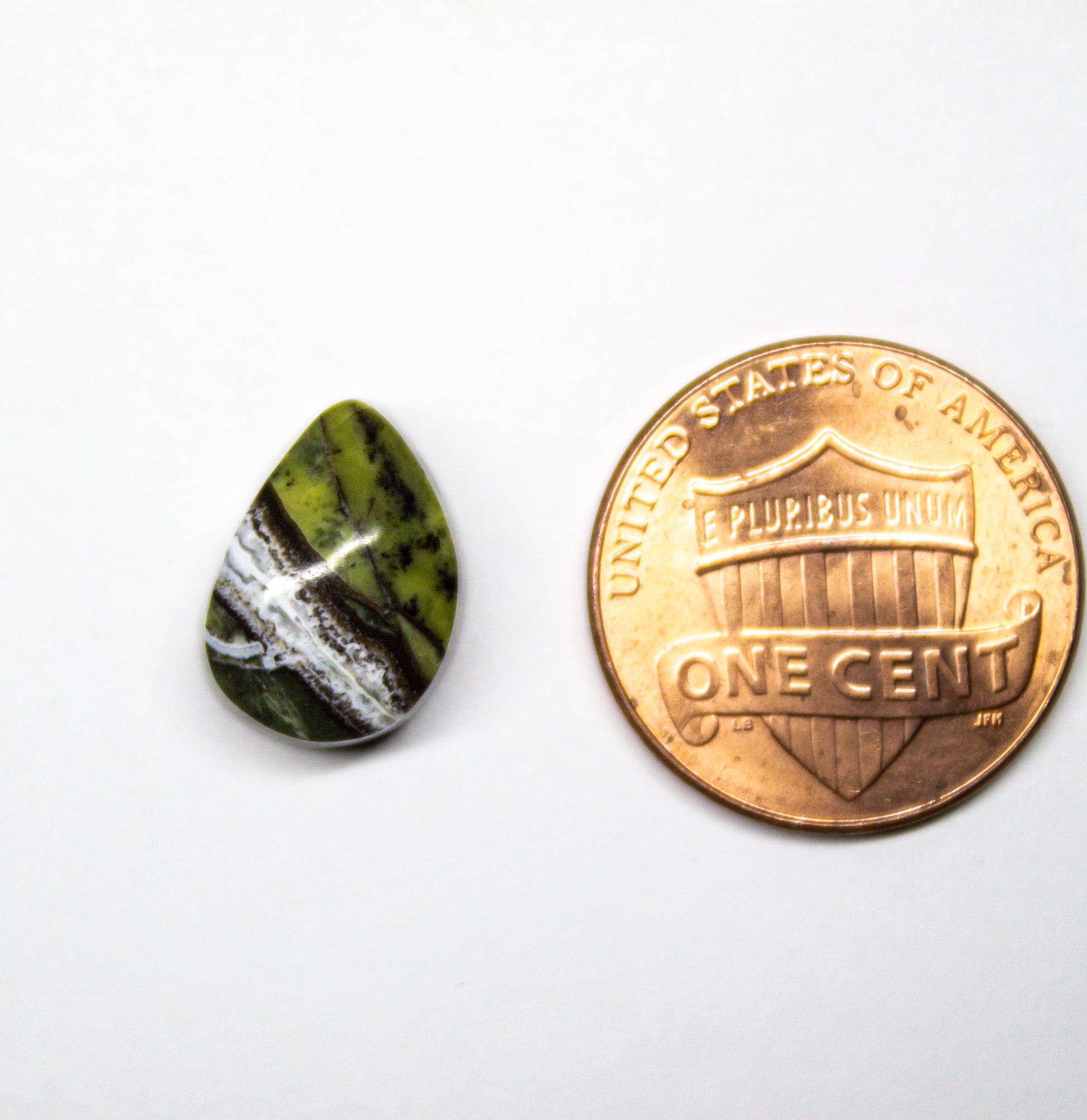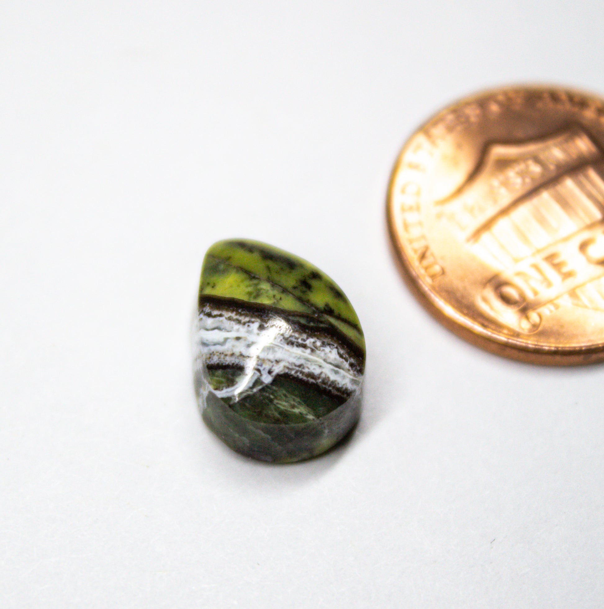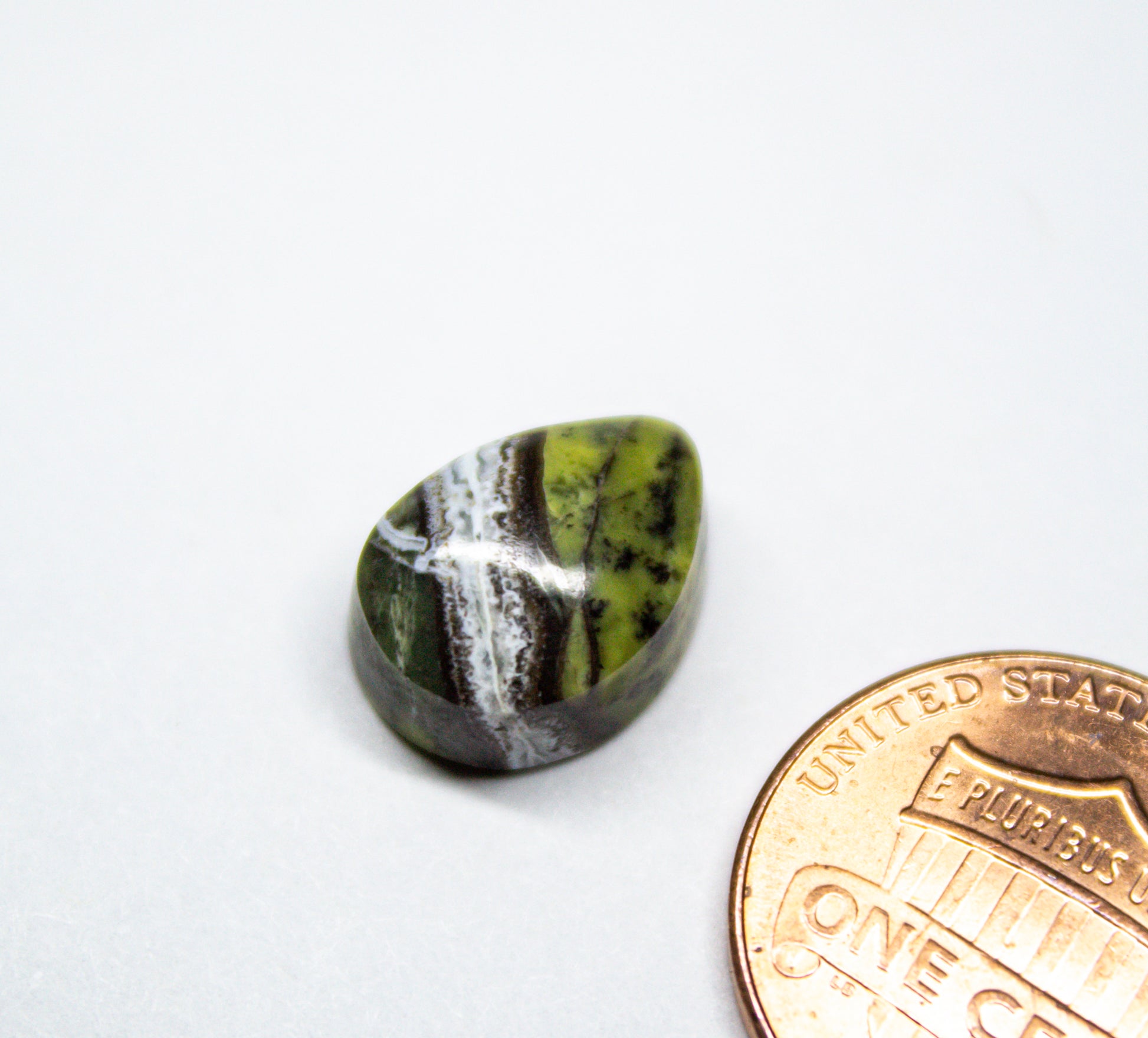 This unique serpentine cabochon, approximately 12mm x 10mm, features a mix of vibrant green tones accented by a bold white and black quartz vein running through its center. The contrast between the green serpentine and the quartz band adds depth making it an eye-catching specimen.