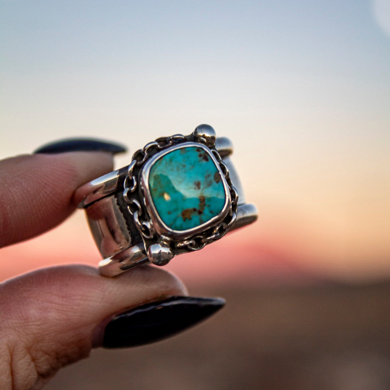 A statement piece rooted in tradition, The Homestead Ring features vintage stock turquoise set in heavy sterling silver. The wide double-band full shank and chain-accented bezel bring a sense of strength and permanence as a nod to heirloom craftsmanship built to last through generations.