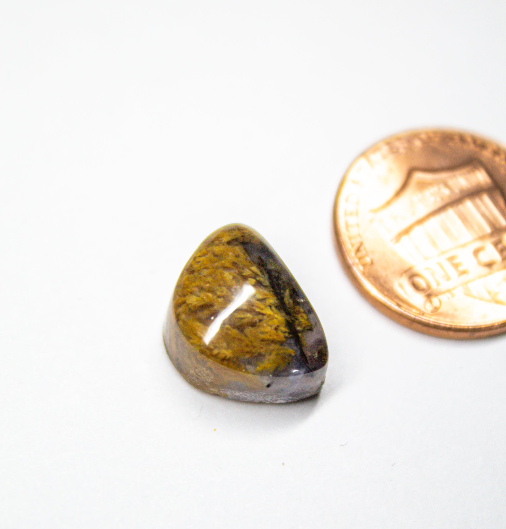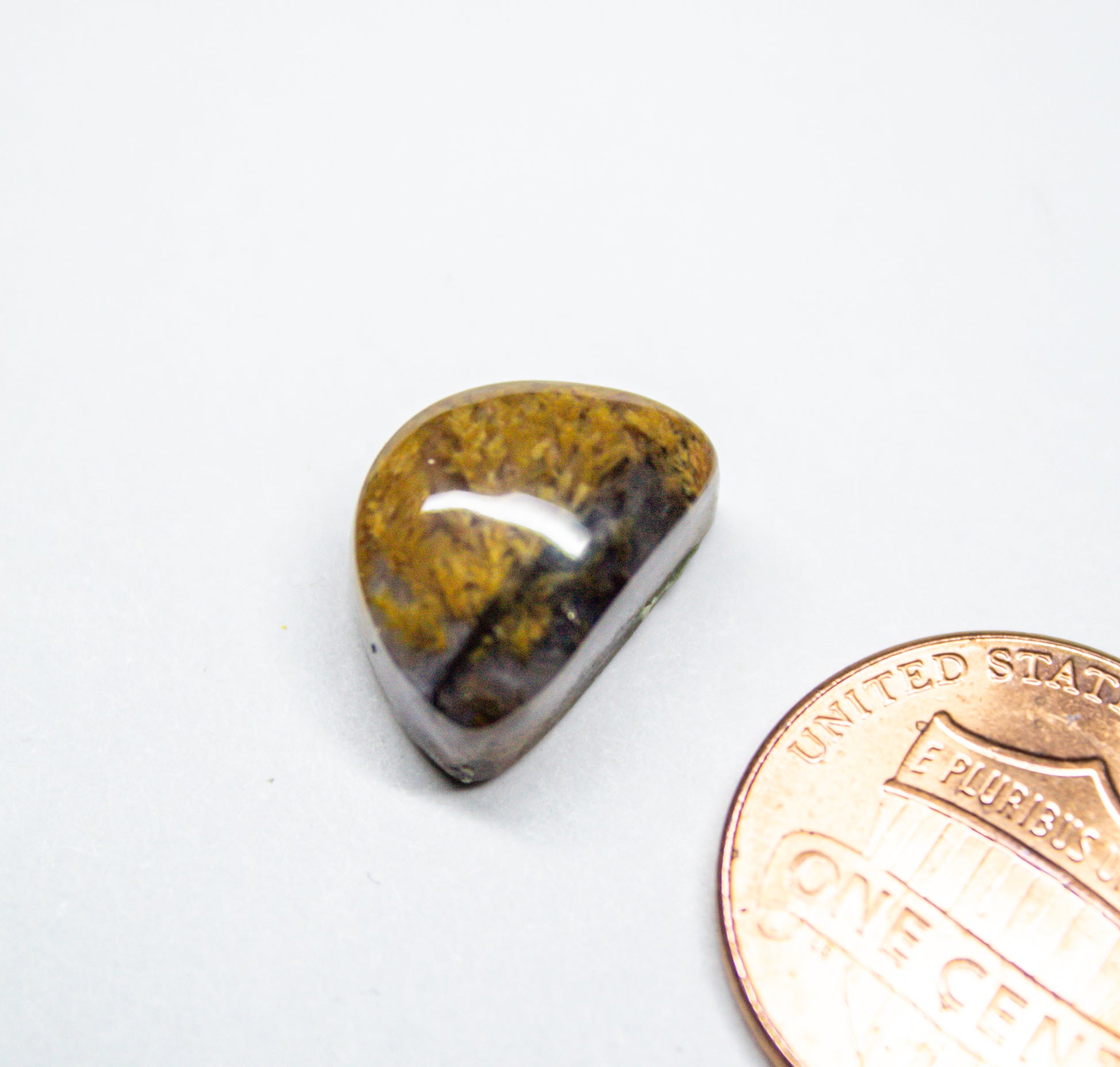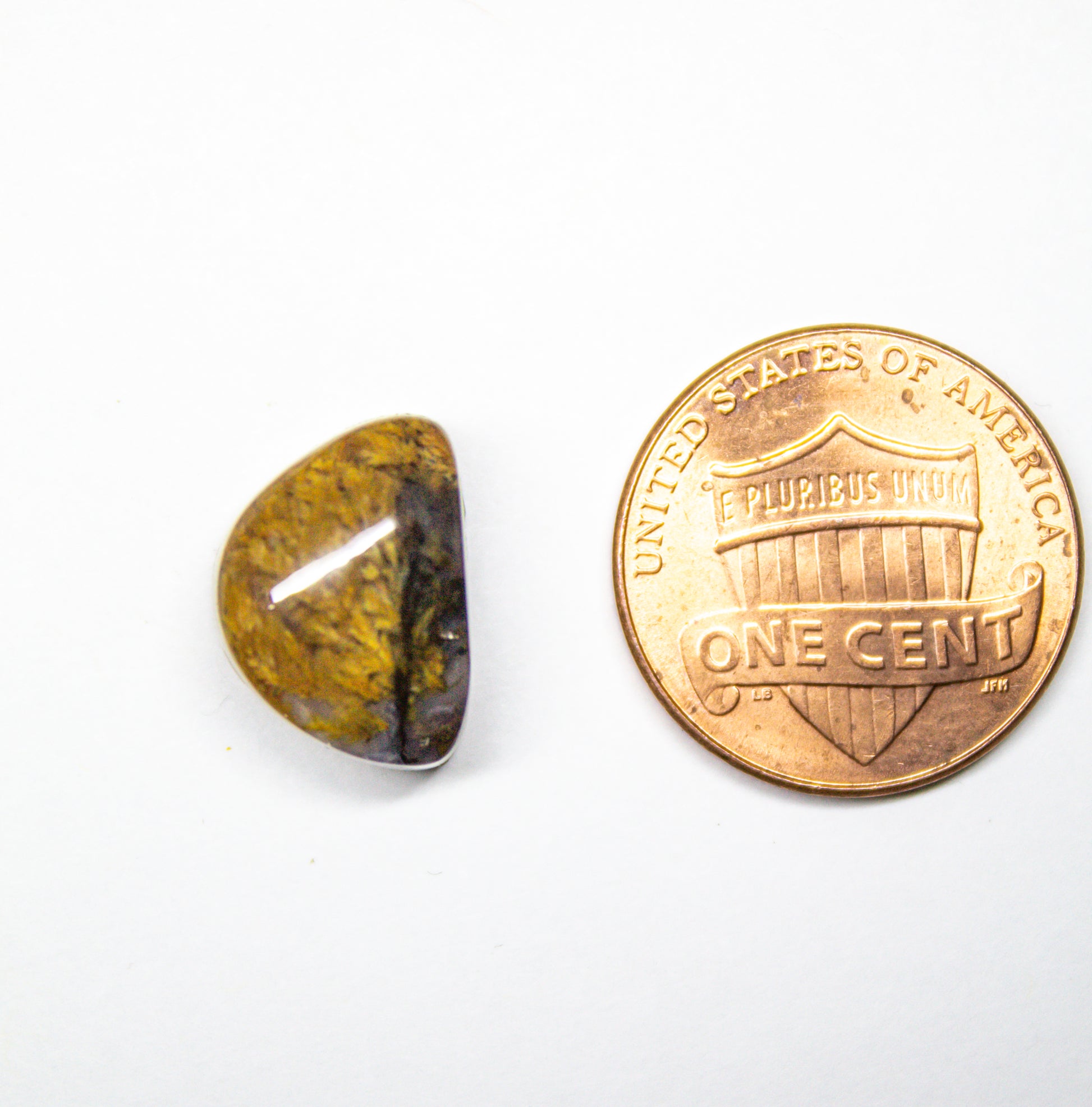 This polished moon shaped Utah moss agate cabochon, approximately 12mm x 10mm, features intricate moss-like inclusions in earthy tones of yellow and brown, set against a translucent matrix. The natural patterns resemble ancient forests or landscapes, giving the stone a uniquely organic and earthy appeal.