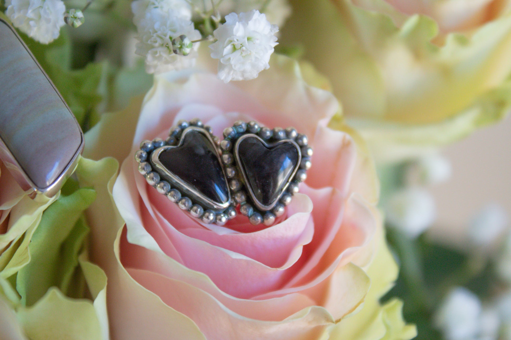 Hand-cut Utah obsidian shaped into small hearts and set in sterling silver, finished with a delicate silver bead border. Glossy black and reflective, they feel a little emo, a little dark chocolate, sweet but not soft.