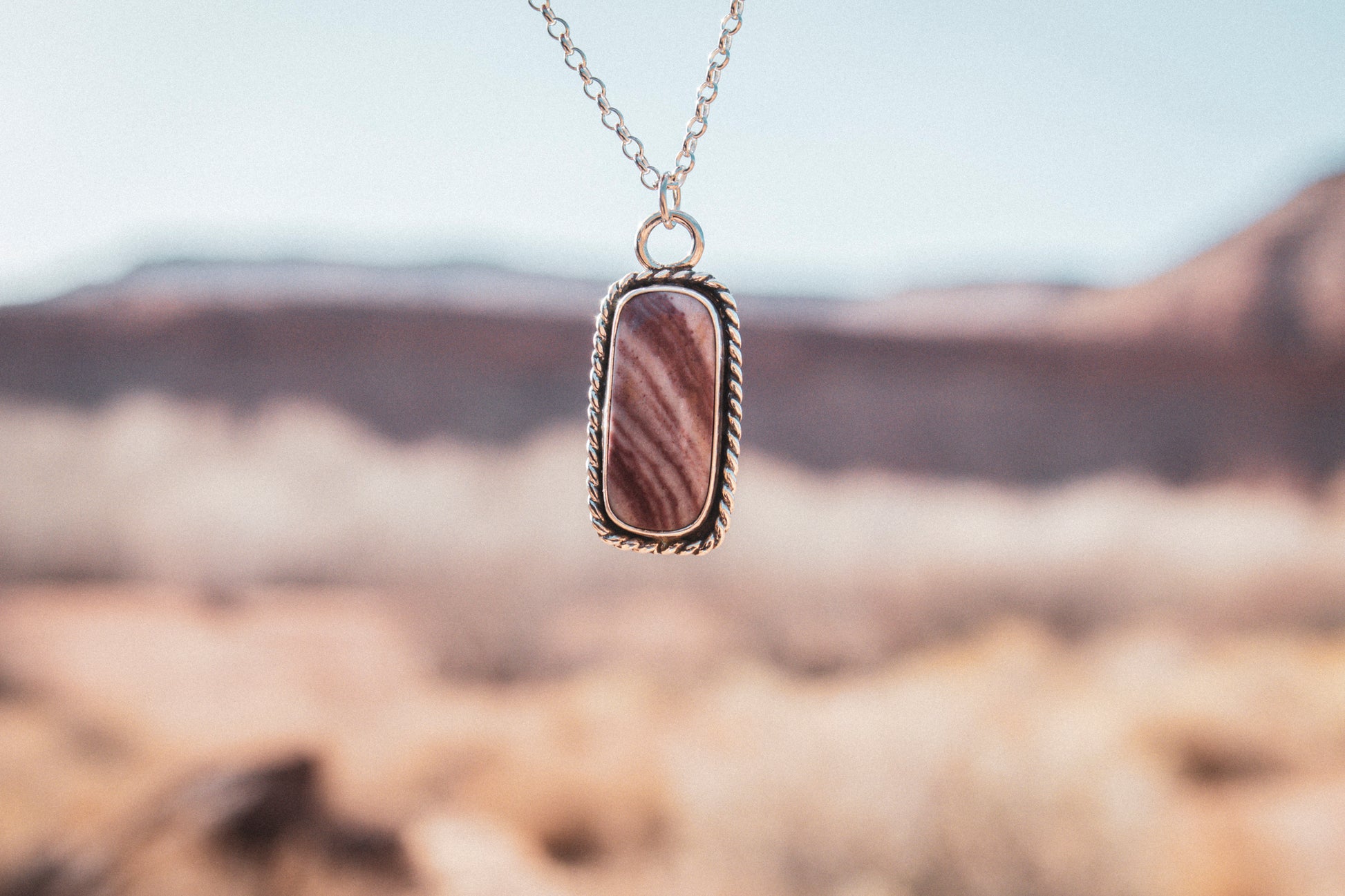 This handcrafted sterling silver pendant features a Utah Rhyolite, cut and polished to highlight its natural soft, earthy tones. The maroon and cream banding perfectly reflects the beauty of the Utah desert landscapes.