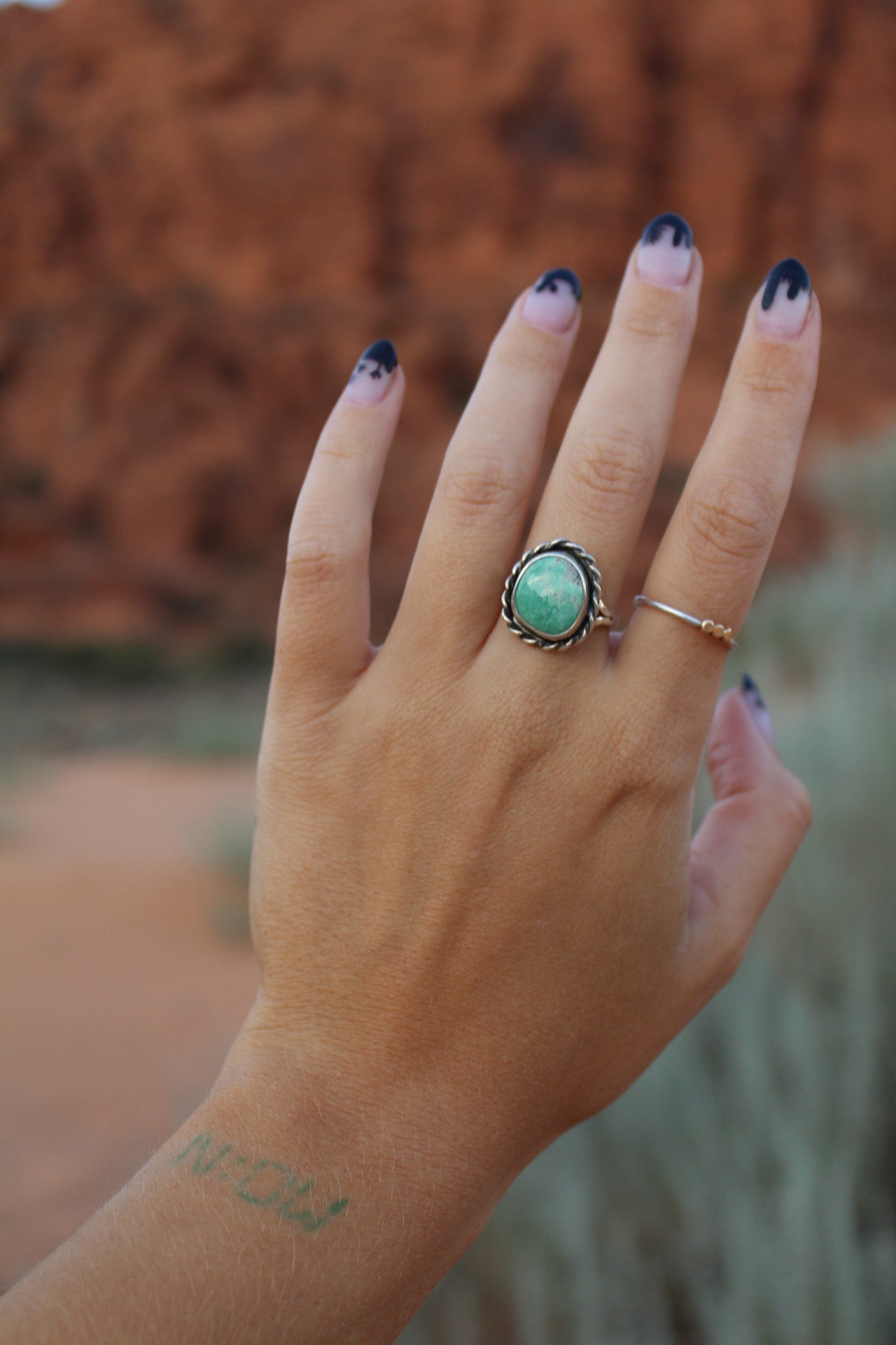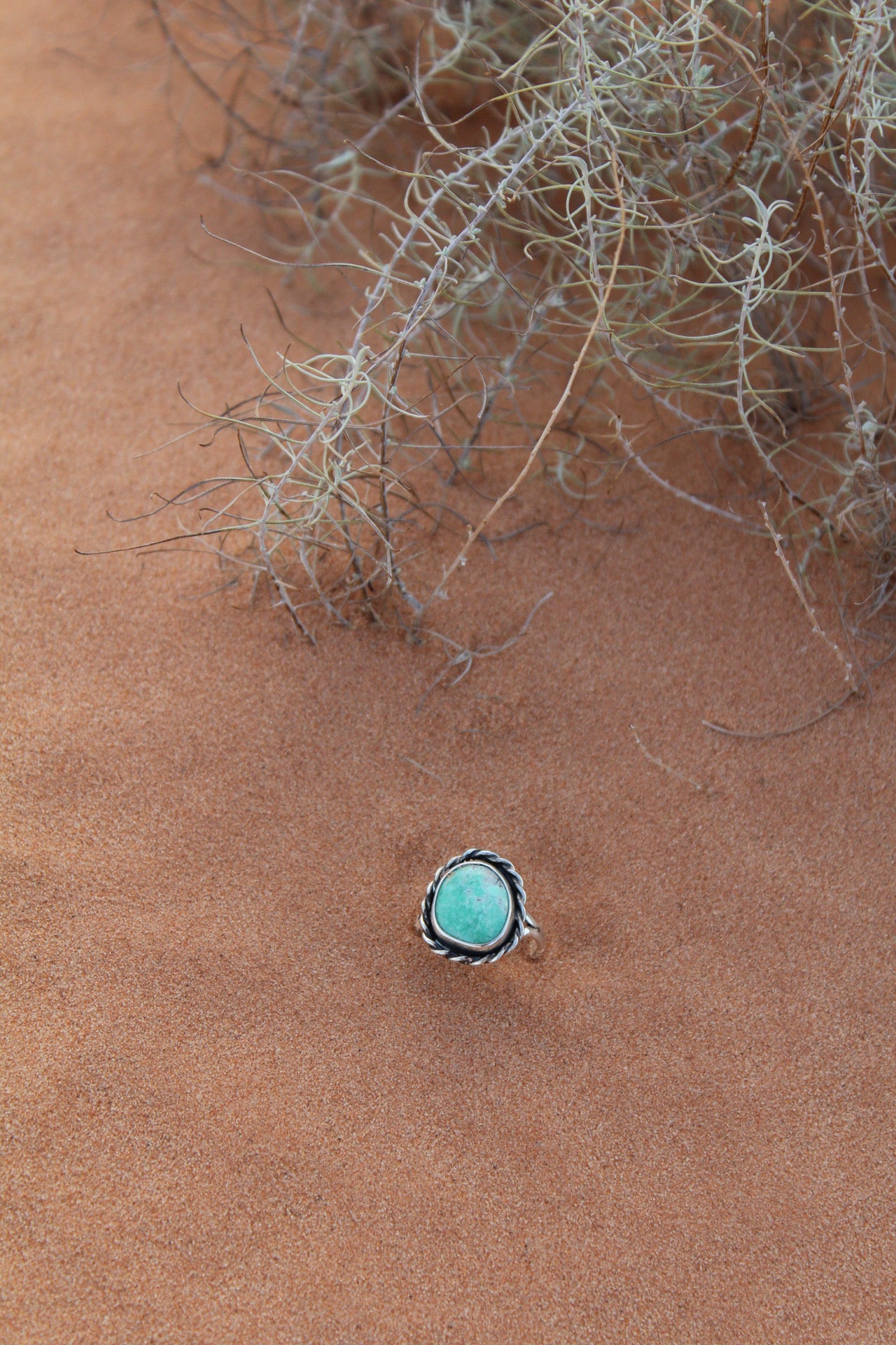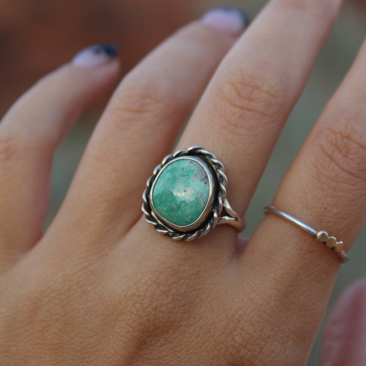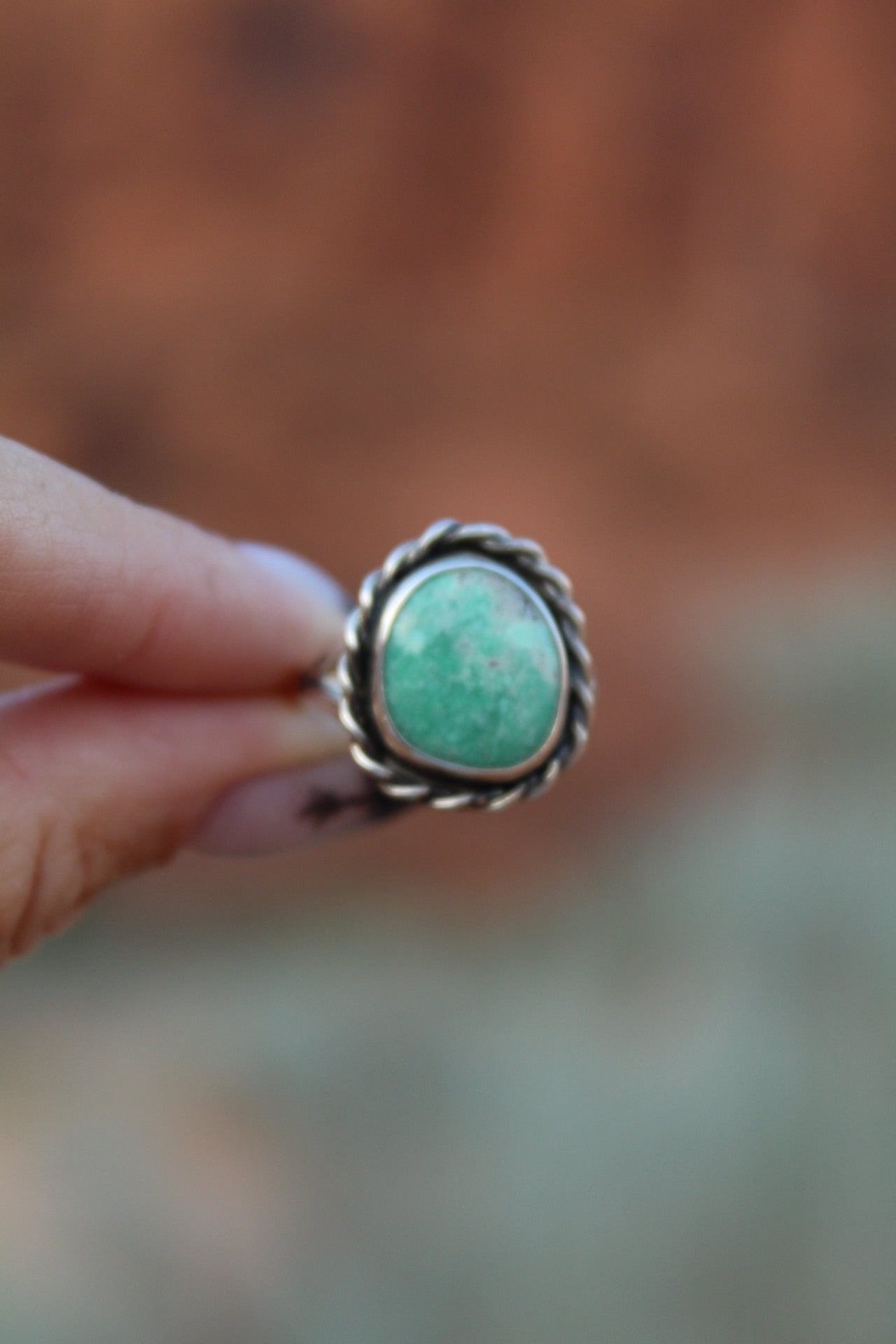 This hand cut Utah Variscite glows with soft sage green tones, framed in a sterling silver rope bezel. Inspired by the desert landscape, this stones earthy hues and classic design make it a timeless everyday piece. Size 7