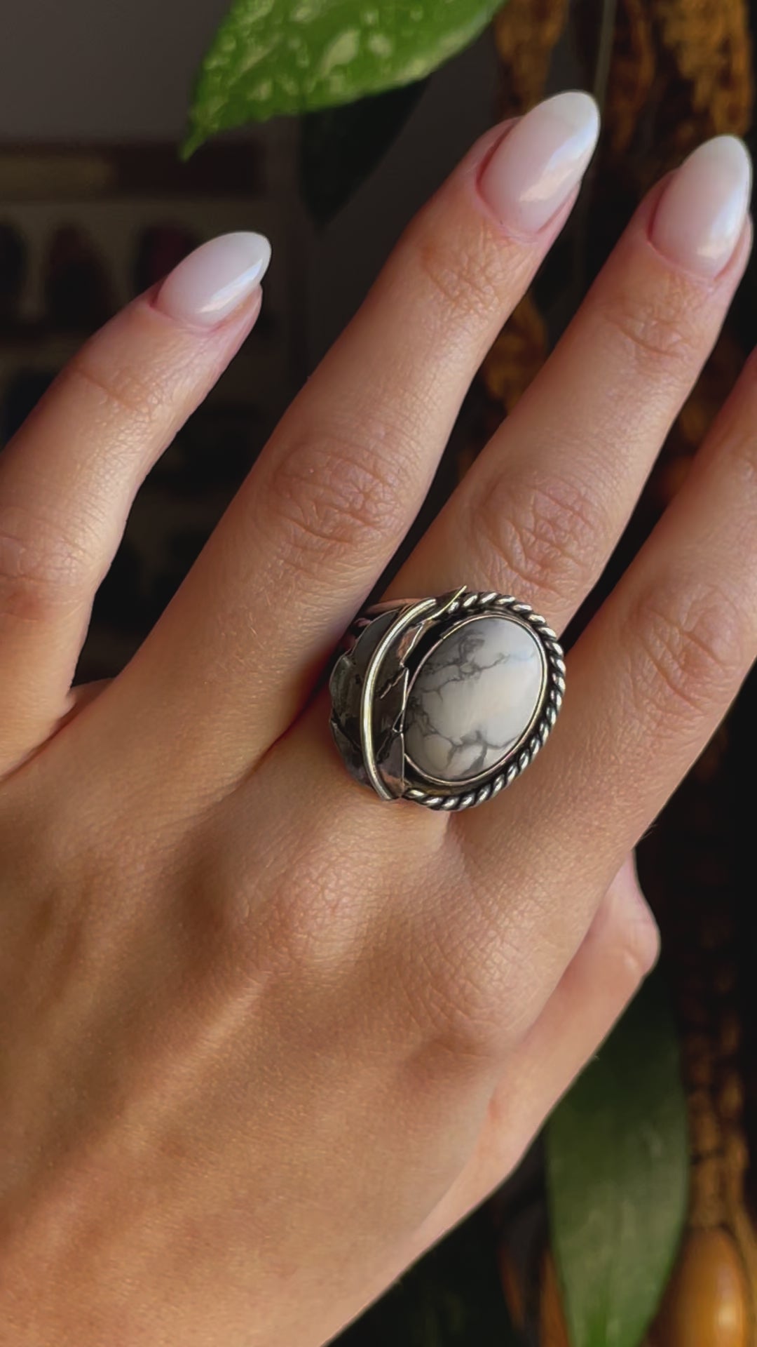 Western style sterling silver howlite ring featuring a triple band and handcrafted feather accent. Size 6.5